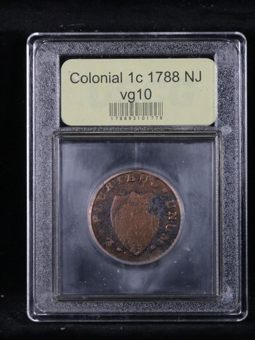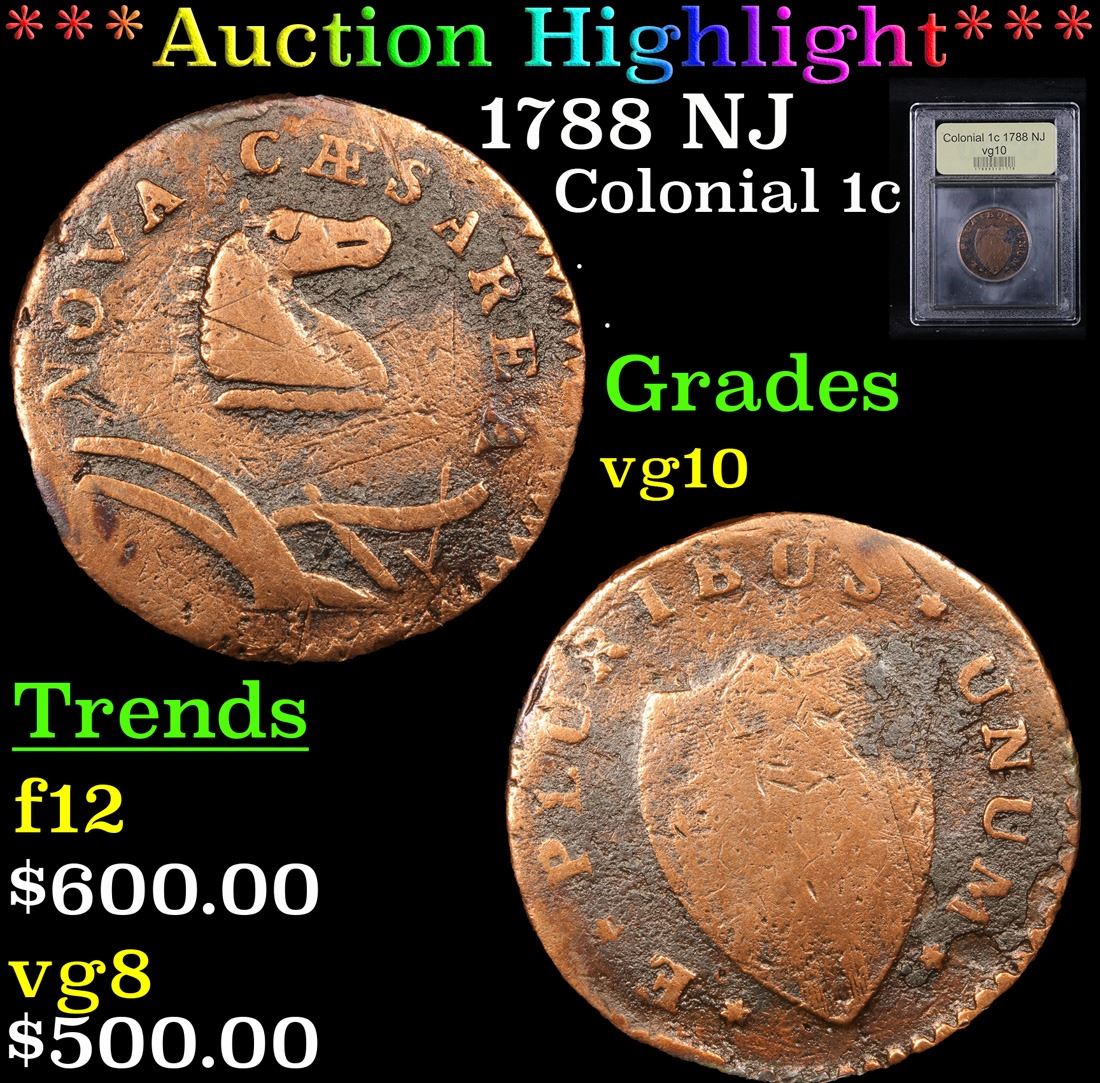 ***Auction Highlight*** 1788 NJ . . Colonial Cent 1c Graded vg+ By USCG. Per Ron Guth of PCGS : The Braided Hair half cents boast some of the lowest mintages of any U.S. coin types and are among the best values, as well. Every date in this type boasts a low mintage. By way of comparison, the mintage of the any Braided hair Half Cent is almost a fraction of the mintage of the 1909-S VDB Lincoln Cent (a far more valuable coin), making this an excellent value.