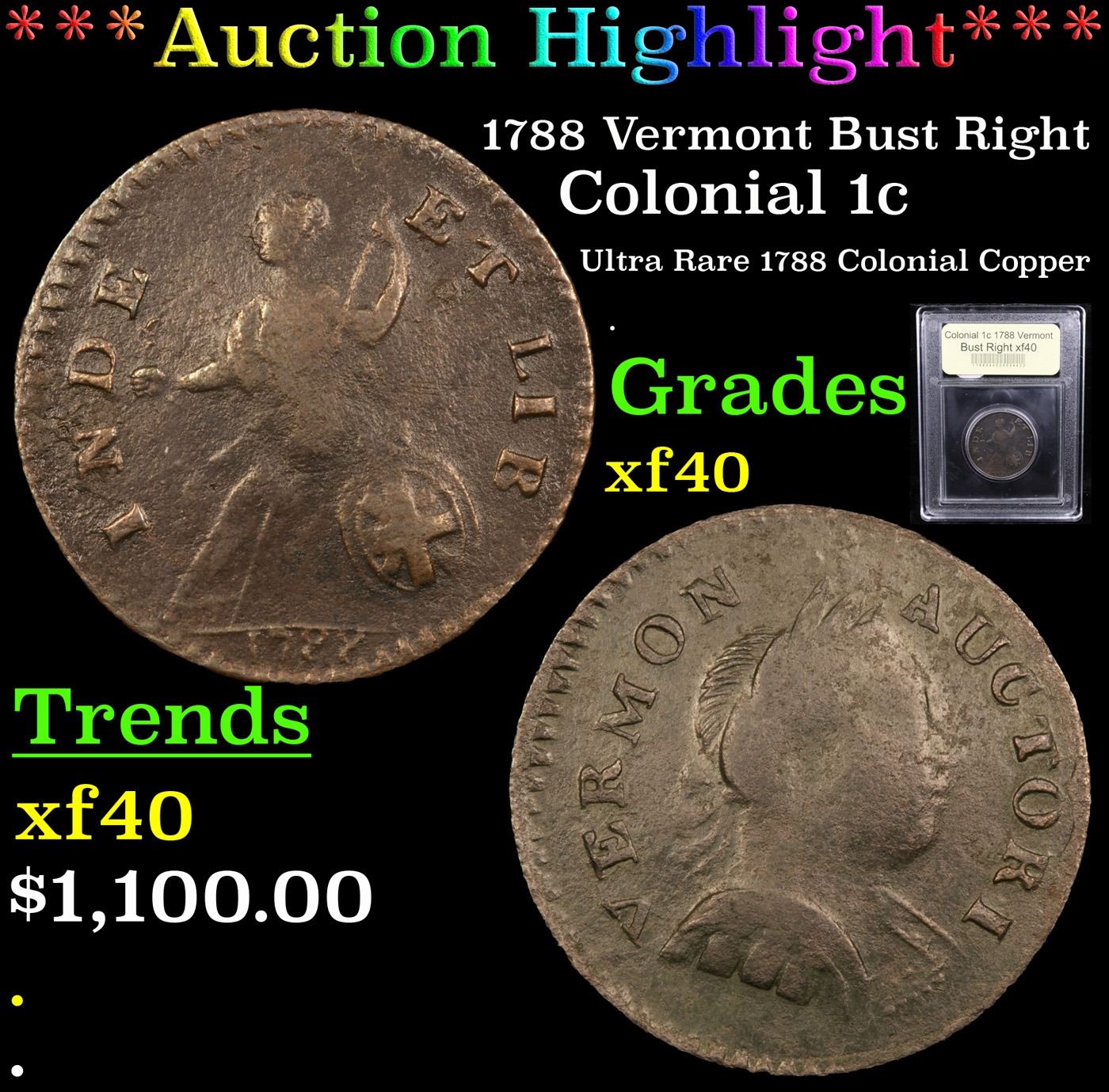 ***Auction Highlight*** 1788 Vermont Bust Right Colonial Cent 1c Graded xf By USCG.         A Corey's Pick, Bid to Win Coin