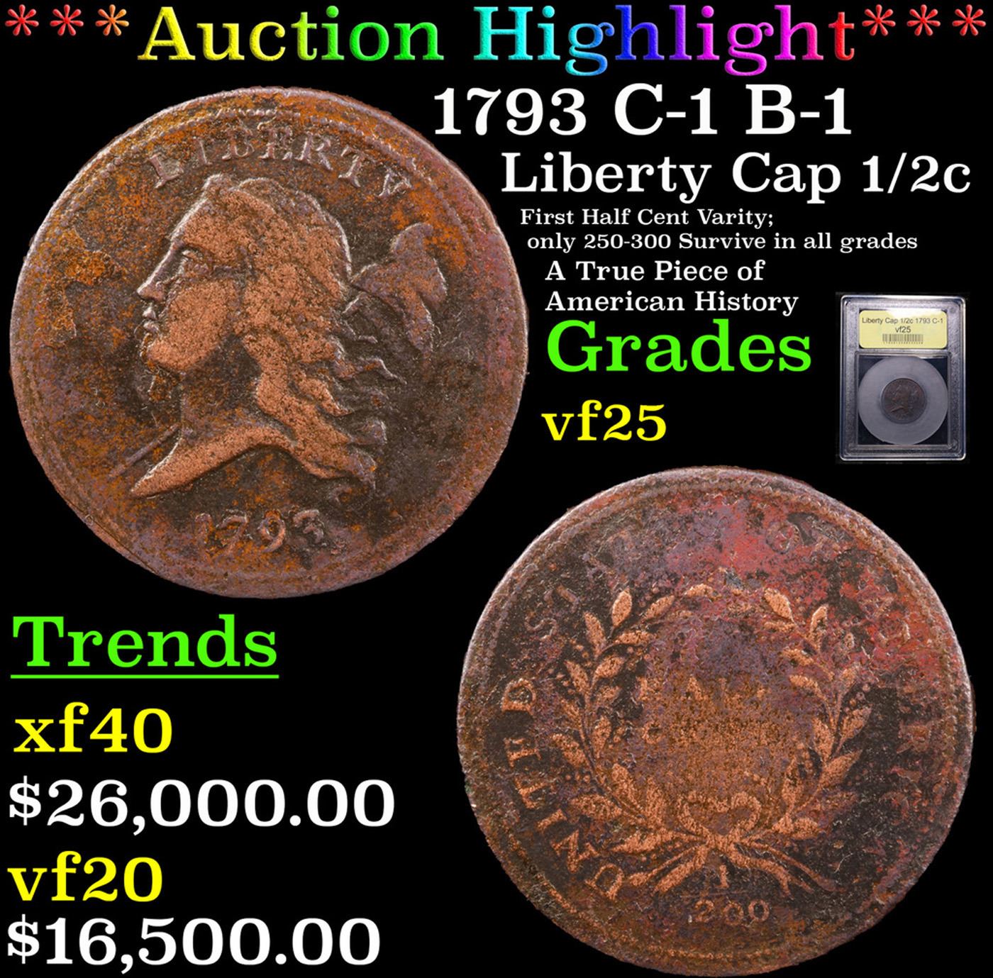 ***Auction Highlight*** 1793 C-1 B-1 Liberty Cap half cent 1/2c Graded vf+ By USCG. Highlight of the entire Auction - The First Half Cent Variety The Cohen-1 die pair is identified as the first half cent variety struck at the Philadelphia Mint in July 1793. An extremely important historical issue with a survival estimated at 250 to 300 pieces in all grades. The total mintage for 1793 half cents was 36,103 coins, and each of the four varieties are nearly equal in rarity, with Cohen-1 slightly scarcer than the other three varieties. This piece combines olive and chocolate-brown patina with slight surface roughness on both sides, but without large marks or other imperfections. The strike is nicely but not perfectly centered. An Outstanding addition to the finest collection, and a piece of American History. Trends vf20 $15,000, xf40 $23,500 A Corey's Pick, Bid to Win, Don't let it get Away, you might not find its equal Coin. I give this coin my highest recommendation
