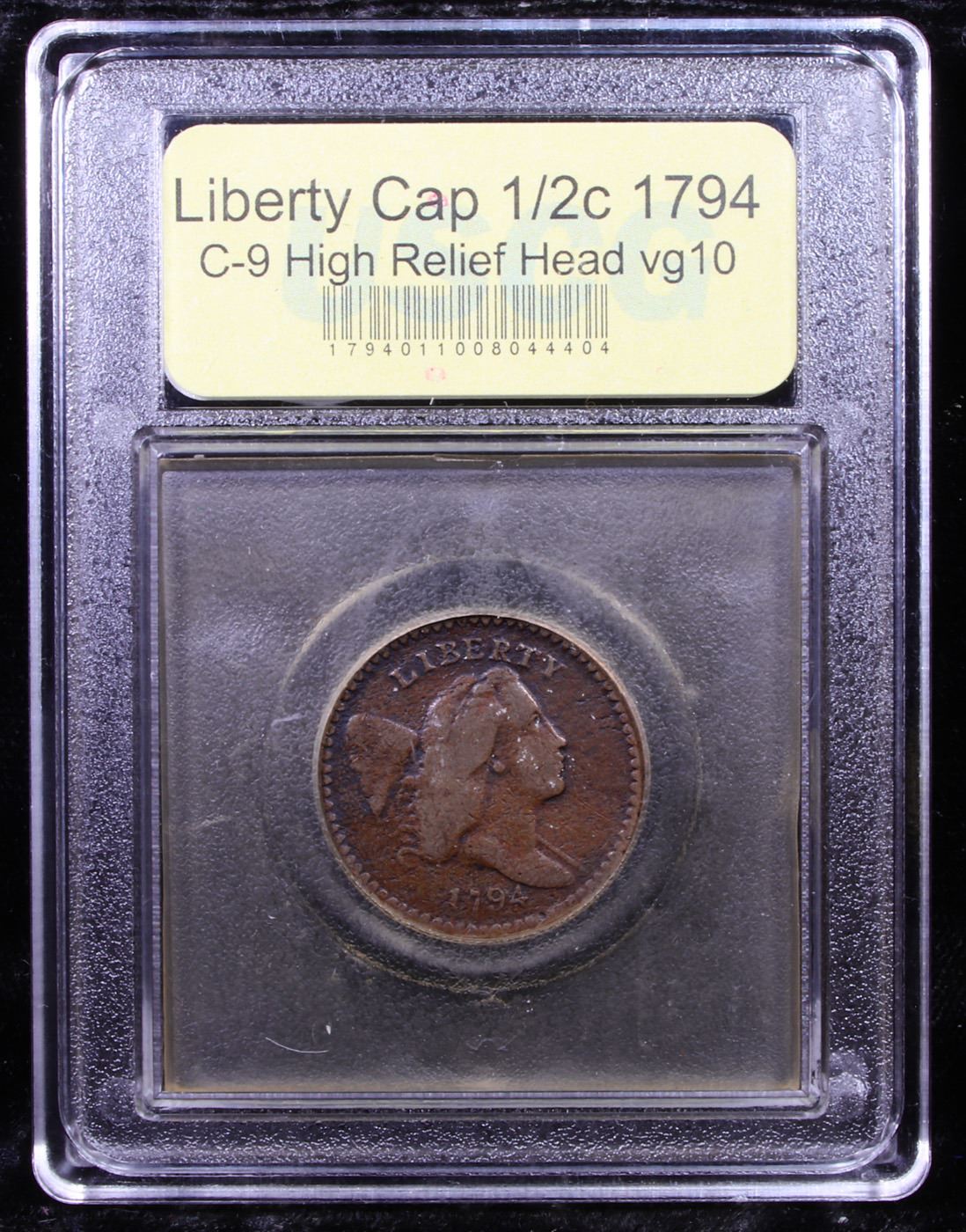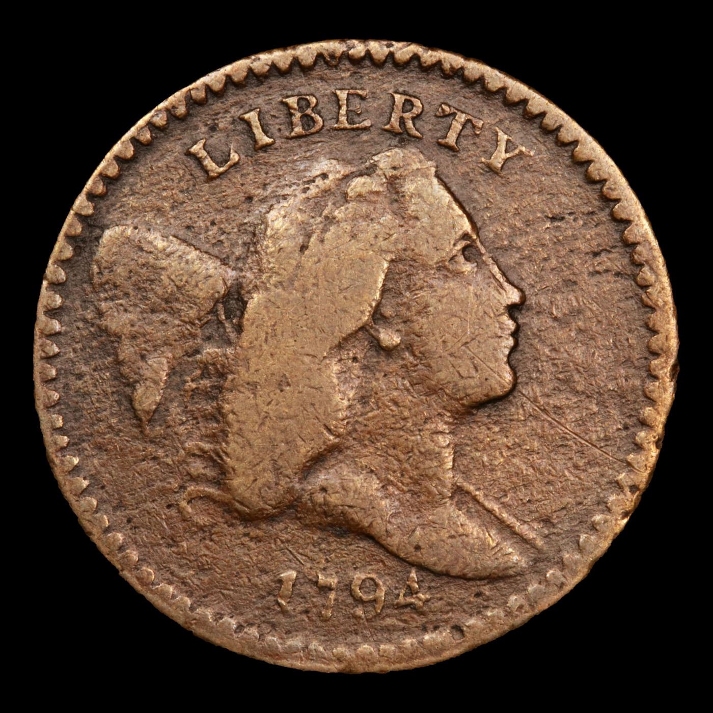 ***Auction Highlight*** 1794 C-9 R2 High Relief Head Liberty Cap half cent 1/2c Graded vg+ By USCG. The popular High Relief head of Liberty is instantly recognized, here with the usual reverse. Manley Die State 2.0.A crack extends from the rim near 9:30, through the cap to the hair. The crack through the tops of LIBERTY has not yet formed. All legends are bold except HALF CENT, which is faint but fully readable. This worn but pleasing example exhibits light brown high-points and rich steel and olive-brown fields. A Corey's Pick, Bid to Win Coin