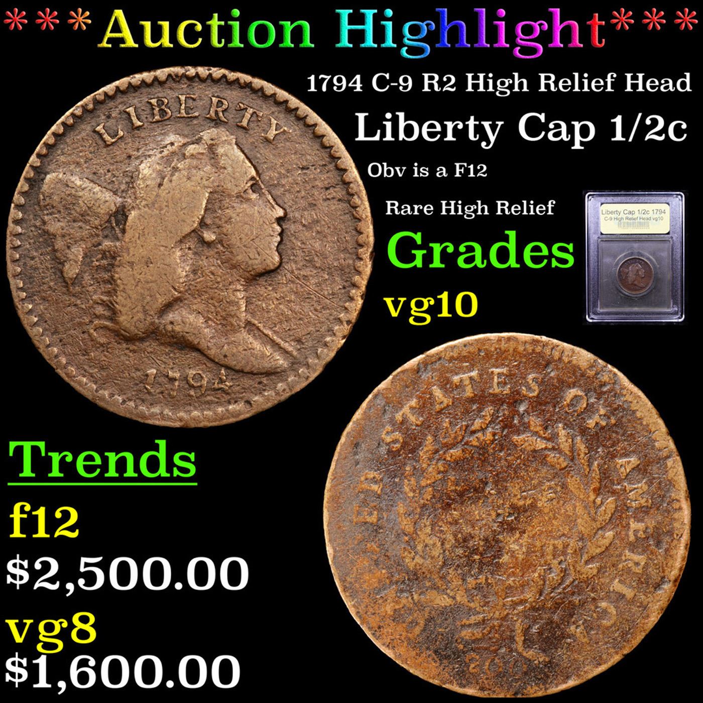 ***Auction Highlight*** 1794 Cohen 9 R2 Liberty Cap half cent 1/2c Graded vg+ By USCG. The popular High Relief head of Liberty is instantly recognized, here with the usual reverse. Manley Die State 2.0.A crack extends from the rim near 9:30, through the cap to the hair. The crack through the tops of LIBERTY has not yet formed. All legends are bold except HALF CENT, which is faint but fully readable. This worn but pleasing example exhibits light brown high-points and rich steel and olive-brown fields