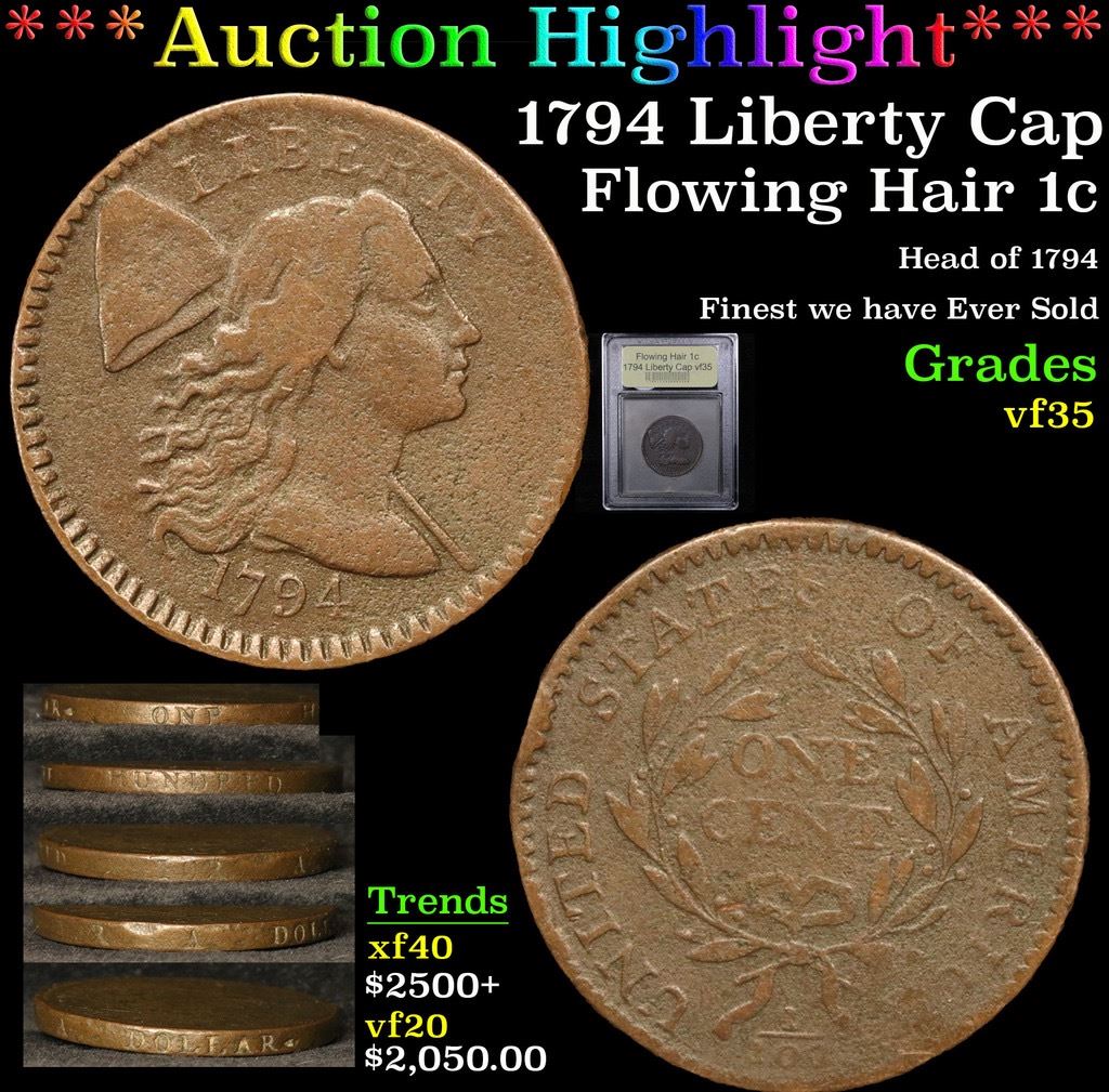 ***Auction Highlight*** 1794 Liberty Cap . . Flowing Hair large cent 1c Graded vf++ By USCG.