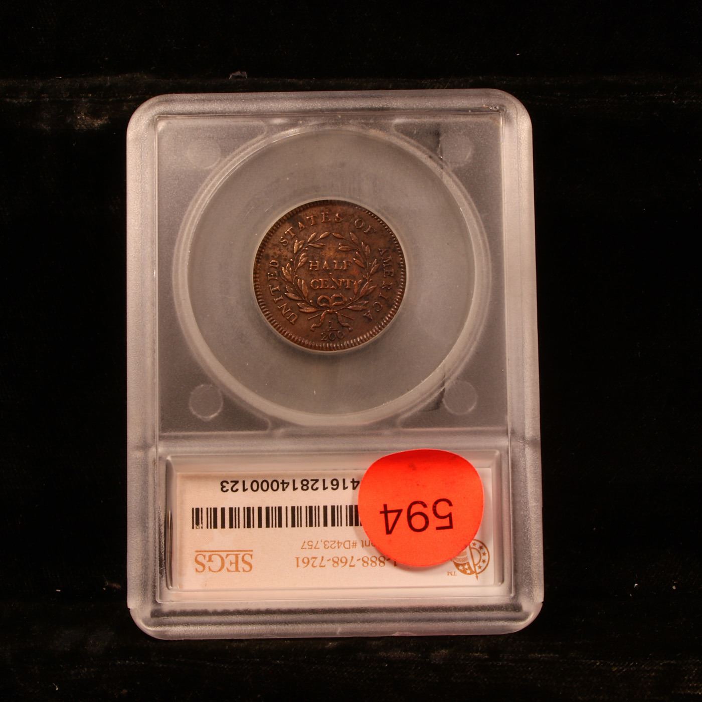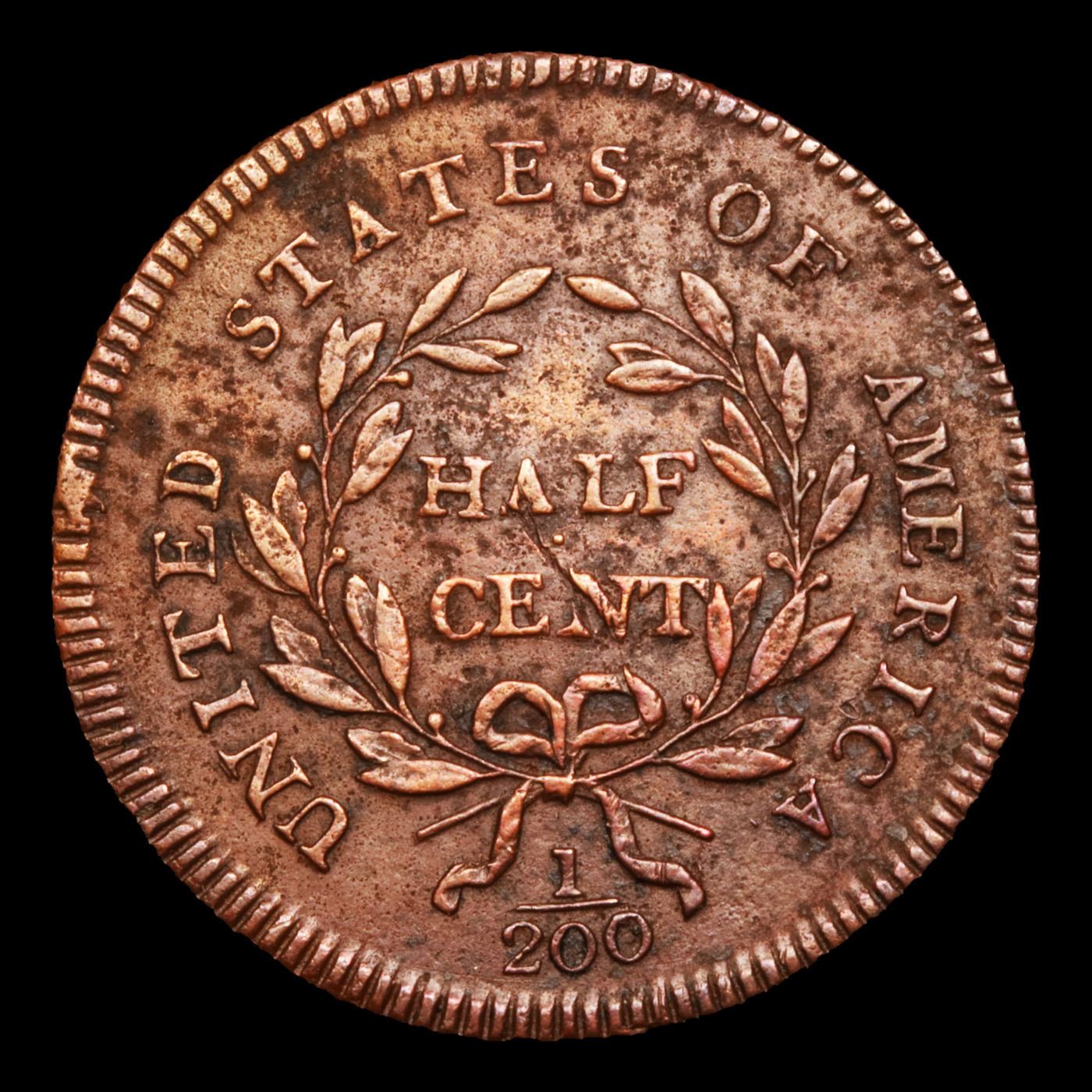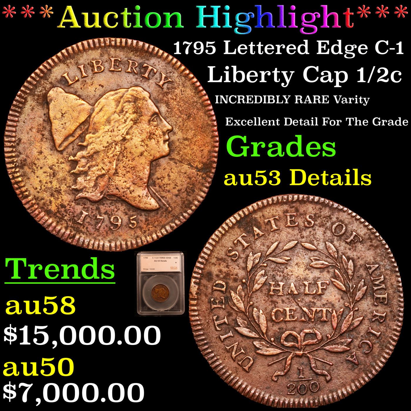 ***Auction Highlight*** 1795 Lettered Edge C-1 Liberty Cap half cent 1/2c Graded au53 Details By SEGS. The first two decades of the United States Mint's half cent production saw numerous design alterations, both purposeful and unintentional. Though several contemporary denominations exhibit similar diversity, these changes on the half cent sometimes involved the often-overlooked third side of a coin, namely the edge.The earliest half cents of 1795 exhibited a lettered edge, but when the weight of the copper planchets was reduced late in the year it was decided to revert to a plain edge in order to accommodate the reduced thickness and circumvent the difficulty of shrinking the edge lettering. Though largely struck in 1796, these plain edge coins still employed 1795-dated dies and are considered part of that issue.In addition to the two edge types, four distinct obverse types for 1795 are determined by the presence or absence of a pole projecting from Liberty’s neck, and the presence of absence of a die flaw after the first digit of the date. It is the combination of these obverse and edge types that constitute the four prominent varieties that all 1795 half cents can be categorized under: Lettered Edge, With Pole; Lettered Edge, Punctuated Date; Plain Edge, Punctuated Date; Plain Edge, No Pole. Each of these four varieties is of similar rarity in circulated grades, with the Lettered Edge becoming slightly scarcer above Extremely Fine.The example offered today has terrific detail throughout the devices, especially through liberty’s hair. Some of the original color is even peeking through on the obverse. Corrosion requires the details grade, but the wear definitely puts it squarely in the AU53 range. A Corey's Pick, Bid to Win, Don't let it get Away Coin
