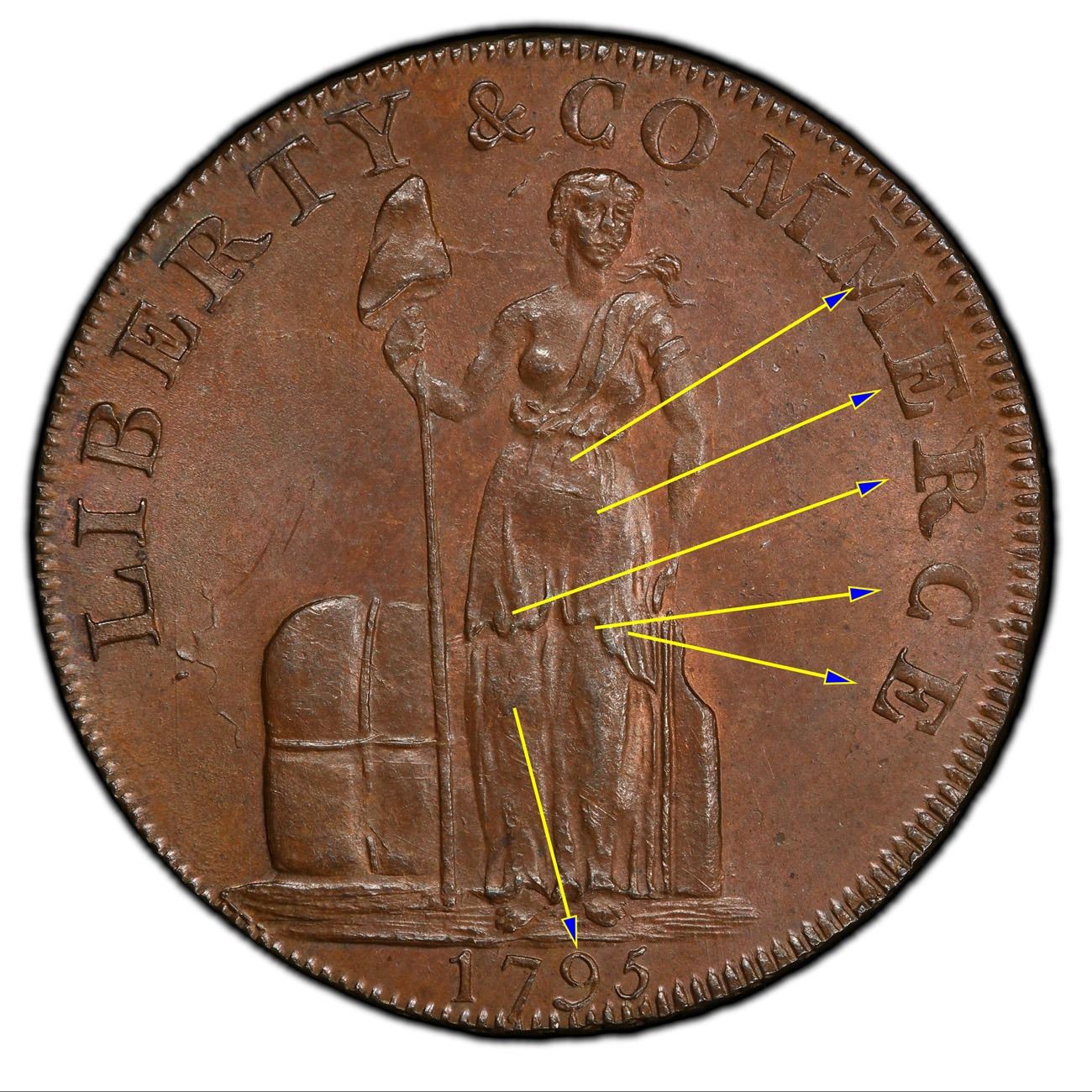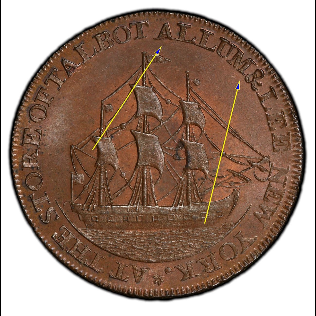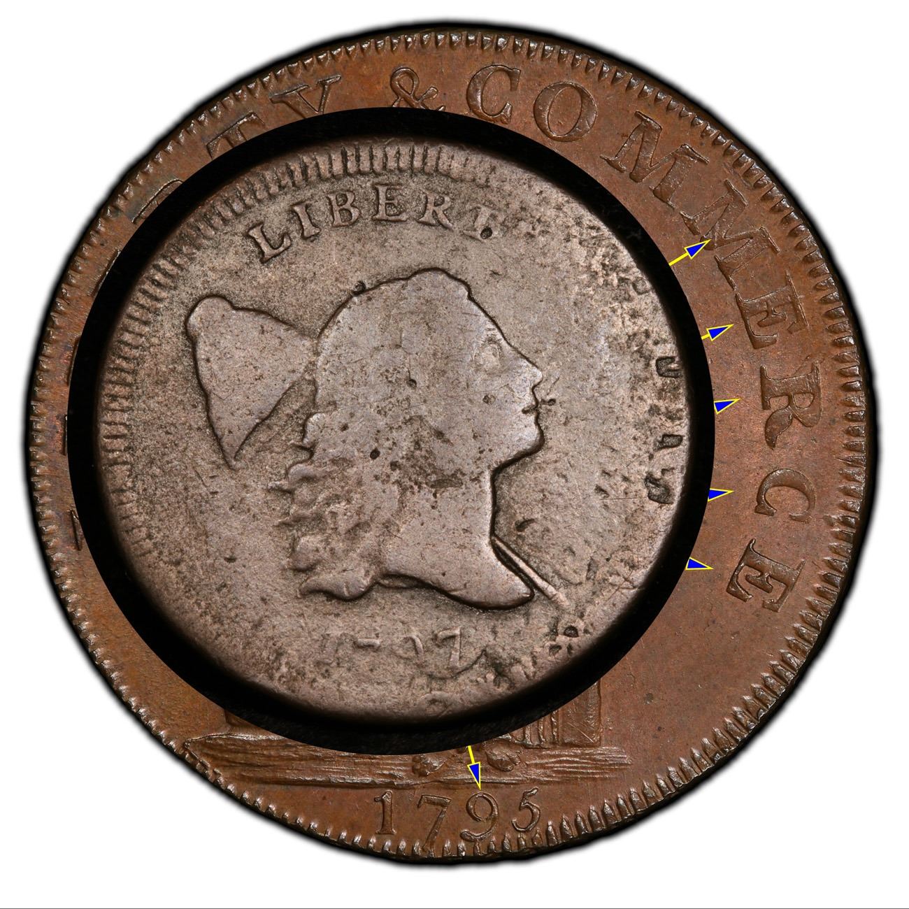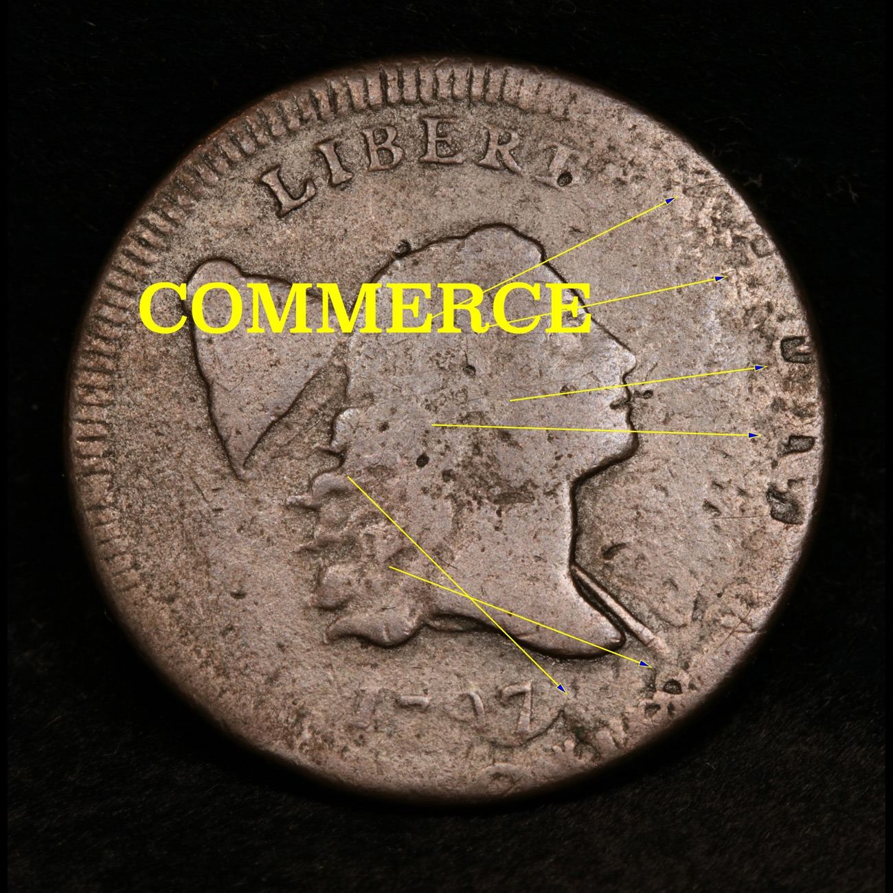 ***Auction Highlight*** 1797 Plain Edge C-2, B-2c Talbot Overstrike Less than 15 known Likely the strongest Example In Existence Liberty Cap half cent 1/2c Graded vf, very fine By USCG. Up for auction is an Incredible find. It is a 1797 Rare Half Cent, of which approximately 500 examples of all types have survived. Of these 500, approximately 200, are the plain edge variety. Quoting from Walter Breen “The known population for the 1797 Liberty Cap Half Cent, W-2 (plain edge) is split into three groups, including those on thin planchets with some 250 to 400 pieces known; thick planchets with no trace of an under type enjoying some 50 to 75 pieces extant; and the rarest of the three, thick planchets with traces of a cent under type, of which perhaps just eight to 12 coins are known. Up for auction is one of these 8-12 pieces. Additionally, I have researched this thoroughly, and it is the Talbot Allum cent that was cut down in which the coin was struck over. I have looked at every known example that has come to auction in the last 20 years, and none that I saw has any obvious remnant showing of the old cent. Many had trace elements that can be through careful analysis determined to be struck over, but none were obvious. I also found that the more elements of the original coin showing the higher the auction results. Coins that even had a trace obvious element of the old coin went up not hundreds but thousands. Well, Sandi and I were blown away with this coin at hand. On the reverse, you can clearly see, without aid of any magnification, the large clear letters ALLUM. On the obverse are the fragments of design elements that the other examples determined to be on a Talbot Allum, but none are clear, and would require significant investigation and supposition. But no one can mistake the BOLD and Clear “ALLUM” on the reverse. Incredible piece of American and numismatic history. Finally, the new owner of this magnificent piece of history will probably enjoy the back story, so since I found it, I’ll offer it now :In 1794 William Talbot, William Allum, and James Lee, joined into a partnership to open an East India trading company located at 241 Water Street in New York City. They commissioned and created the first American merchant token produced on a large scale. In fact, so many were produced, the company had more than they could accommodate. On April 23, 1795, William Talbot sold the Philadelphia mint 1,076 pounds of the tokens (about 52,000), mostly the 1795 variety. The mint, desperately seeking copper stock, used these tokens as planchets for the 1795 half cents variety without poles (which were actually minted in the spring of 1796). In 1796 Lee retired, and soon thereafter the firm dissolved. On December 10, 1796, the Philadelphia mint purchased all of the remaining stock of these tokens (1,914 pounds) from Mr. Talbot and used them as planchets for 1797 half cents. Virtually all of which had no trace of the original design remaining when the new striking was complete. A Corey's Pick, Bid to Win, Don't let it get Away, you might not find its equal Coin. I give this coin my highest recommendation