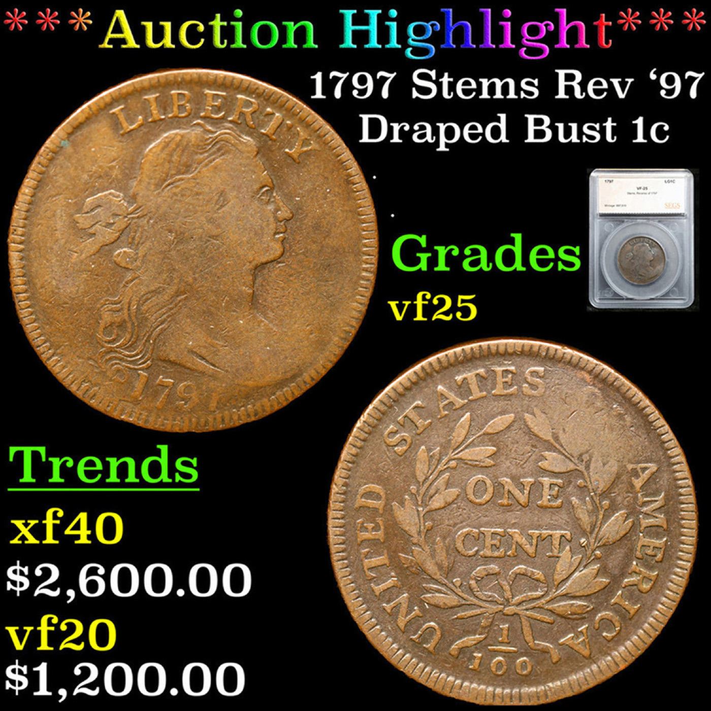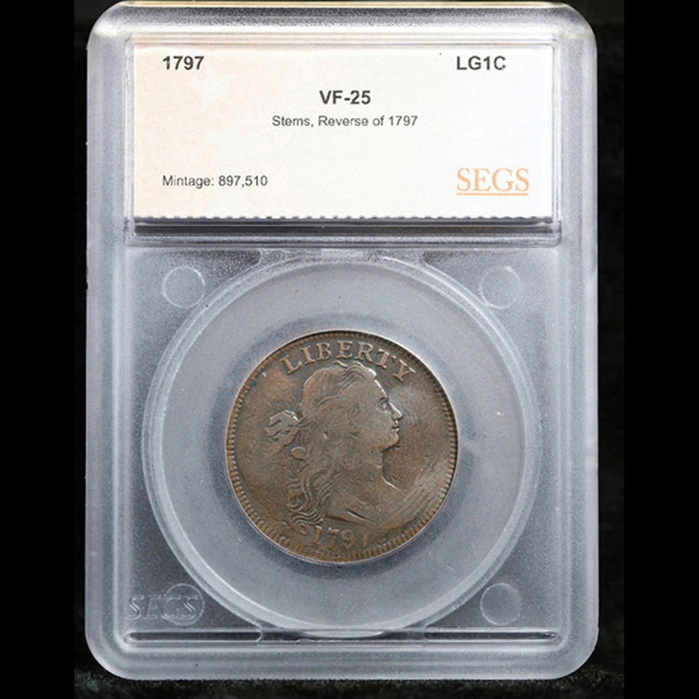 ***Auction Highlight*** 1797 Stems Rev '97 Draped Bust Large Cent 1c Graded vf25 By SEGS (fc)