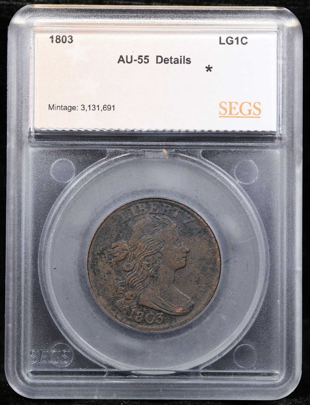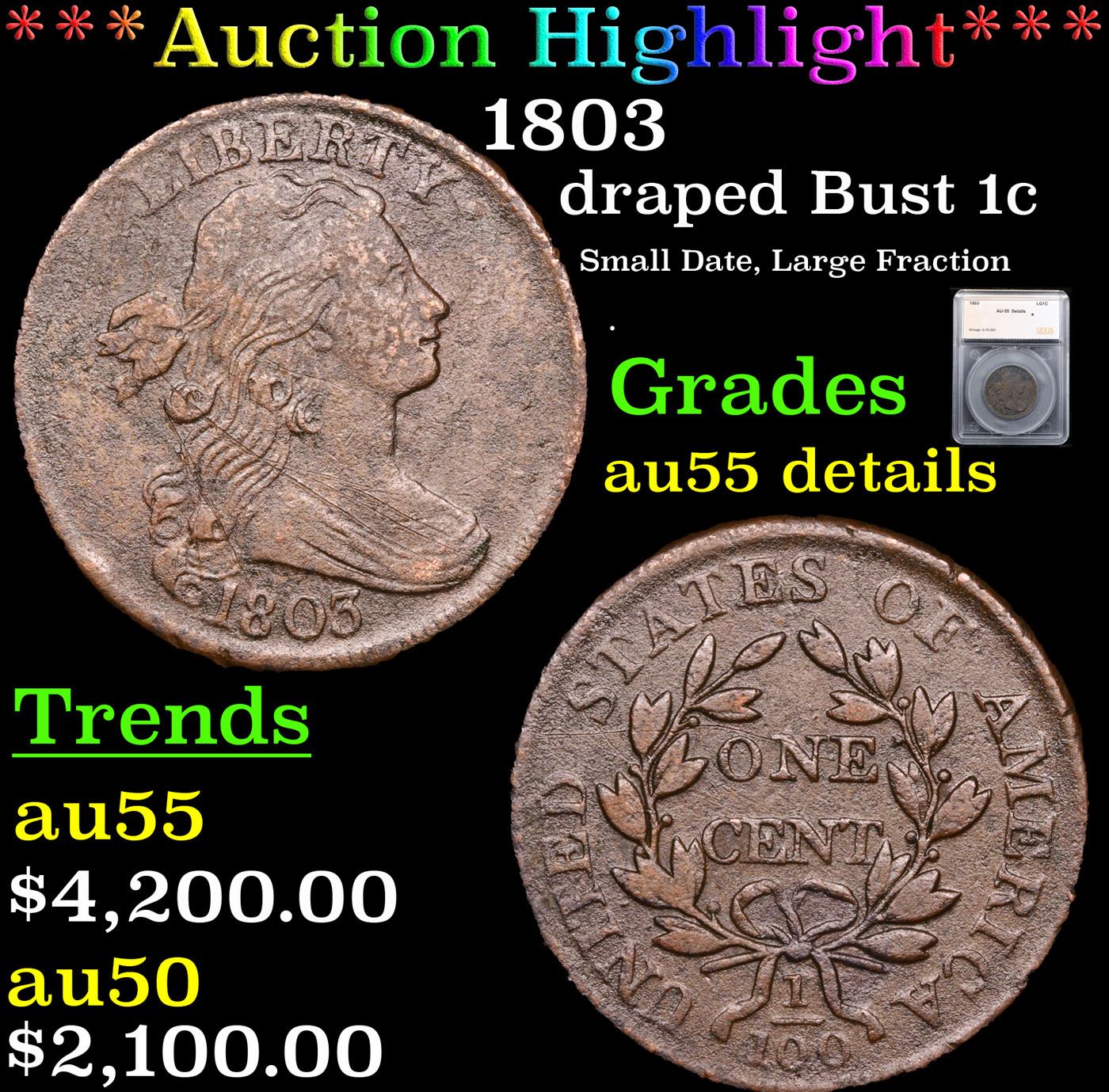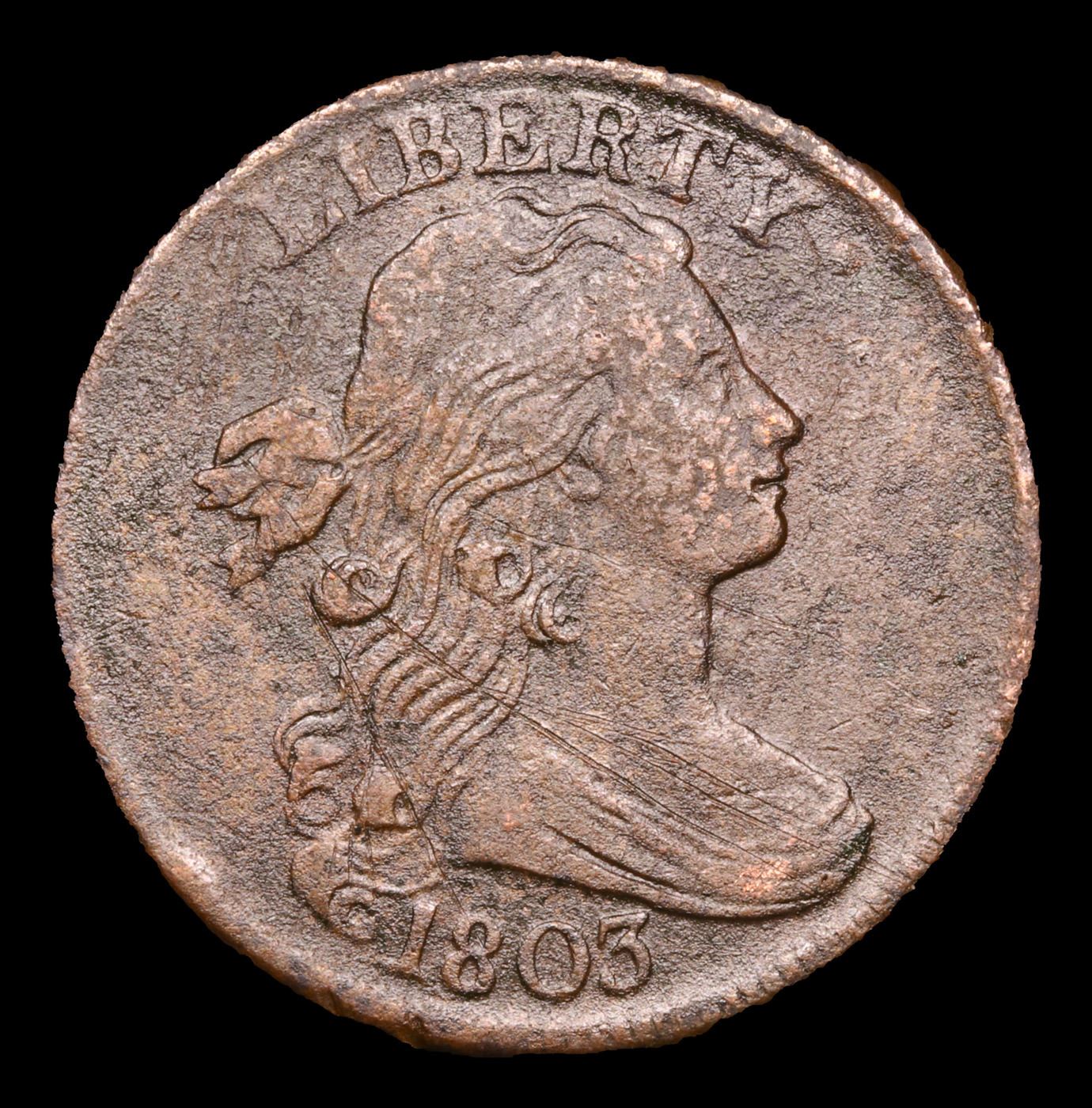 ***Auction Highlight*** 1803 Draped Bust Large Cent 1c Graded au55 details By SEGS.
