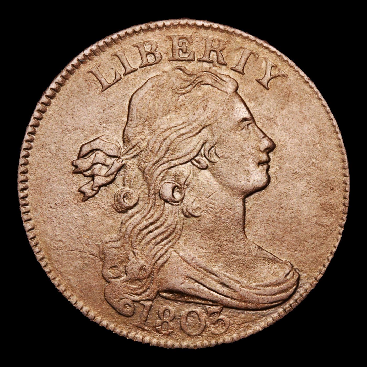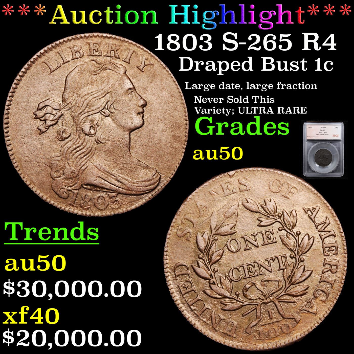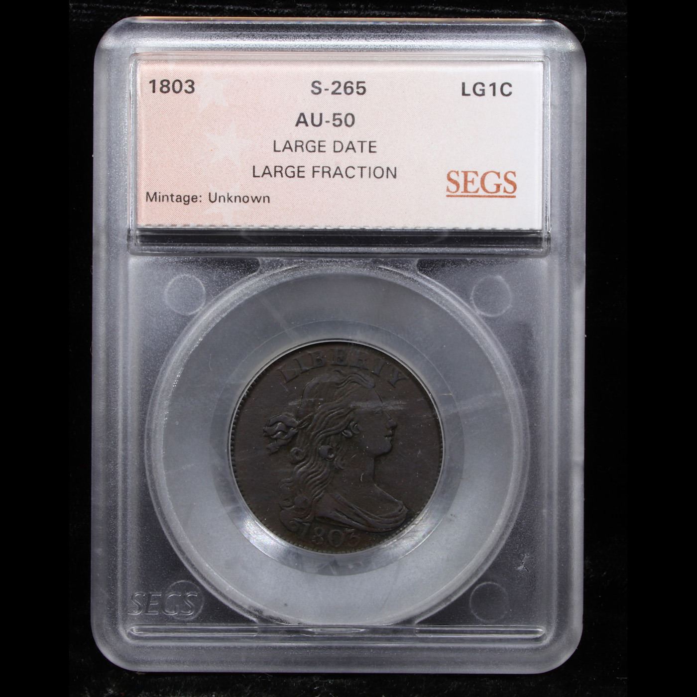 ***Auction Highlight*** 1803 S-265 R4 Draped Bust Large Cent 1c Graded au50 By SEGS. Up for Auction is an Incredibly Rare and Highly sought 1803 Large Dated Large Fraction 1c Sheldon 265 s-265. A must have die pairing for the large cent variety collector, Sheldon-265 is the only marriage that corresponds to the Large Date, Large Fraction Guide Book listing for the date. Examples are scarce and the variety is challenging to find in high grades, with no Mint State examples in either the Bland or 2015 Noyes census listings. The example at hand has terrific detail throughout. Pleasing color and smooth planchet with just a touch of granularity. Far and away the finest 1803 S-265 we have ever been able to bring to auction. I wish you great luck as I anticipate fierce bidding. A Corey's Pick, Bid to Win, Don't let it get Away, you might not find its equal Coin. I give this coin my highest recommendation