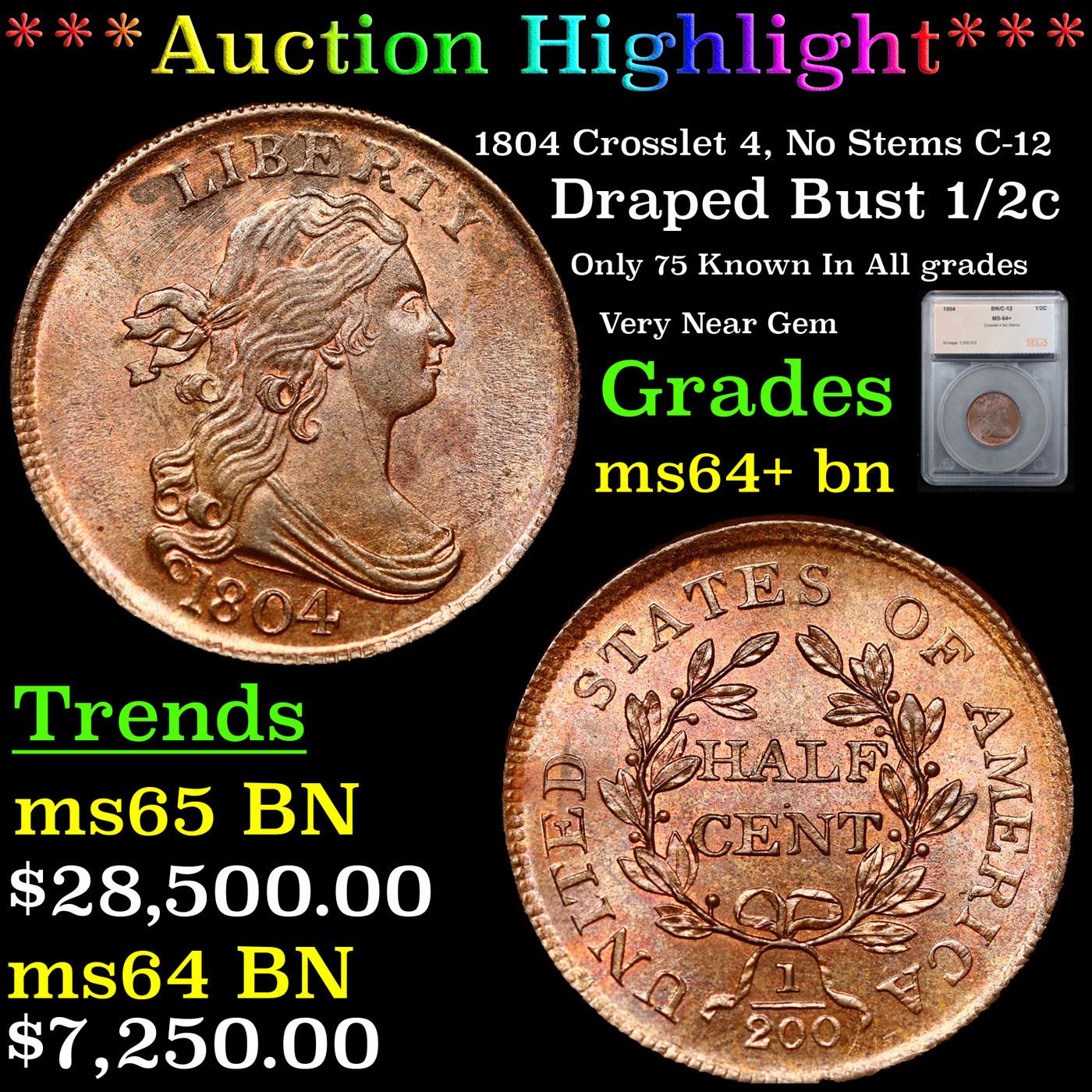 ***Auction Highlight*** 1804 Crosslet 4, No Stems Draped Bust Half Cent C-12 1/2c Graded ms64+ bn By