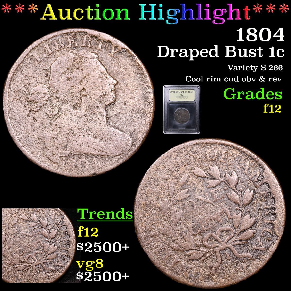 ***Auction Highlight*** 1804 Variety S-266 Cool rim cud obv & rev Draped Bust Large Cent 1c Graded f, fine By USCG. A Corey's Pick, Bid to Win, Don't let it get Away, you might not find its equal Coin