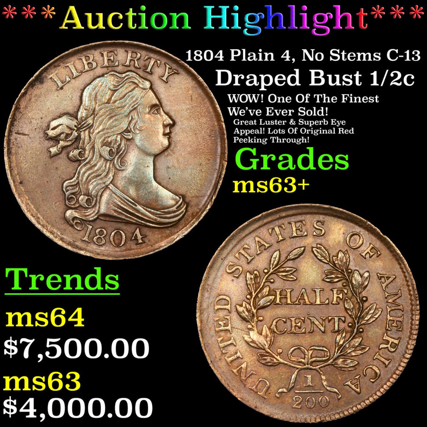 ***Auction Highlight*** 1804 Plain 4, No Stems Draped Bust Half Cent C-13 1/2c Graded ms63+ By SEGS