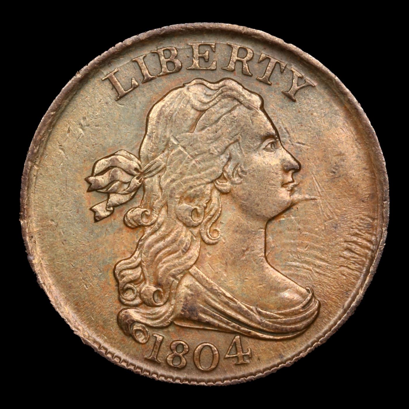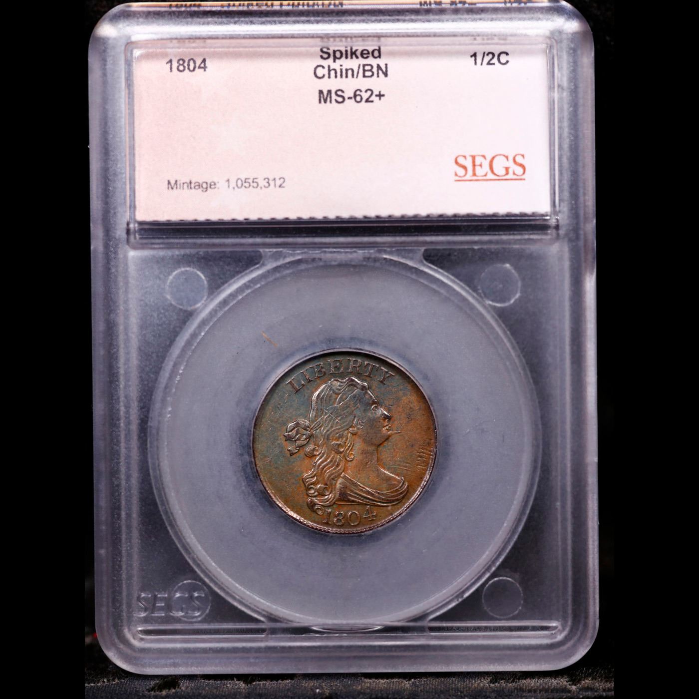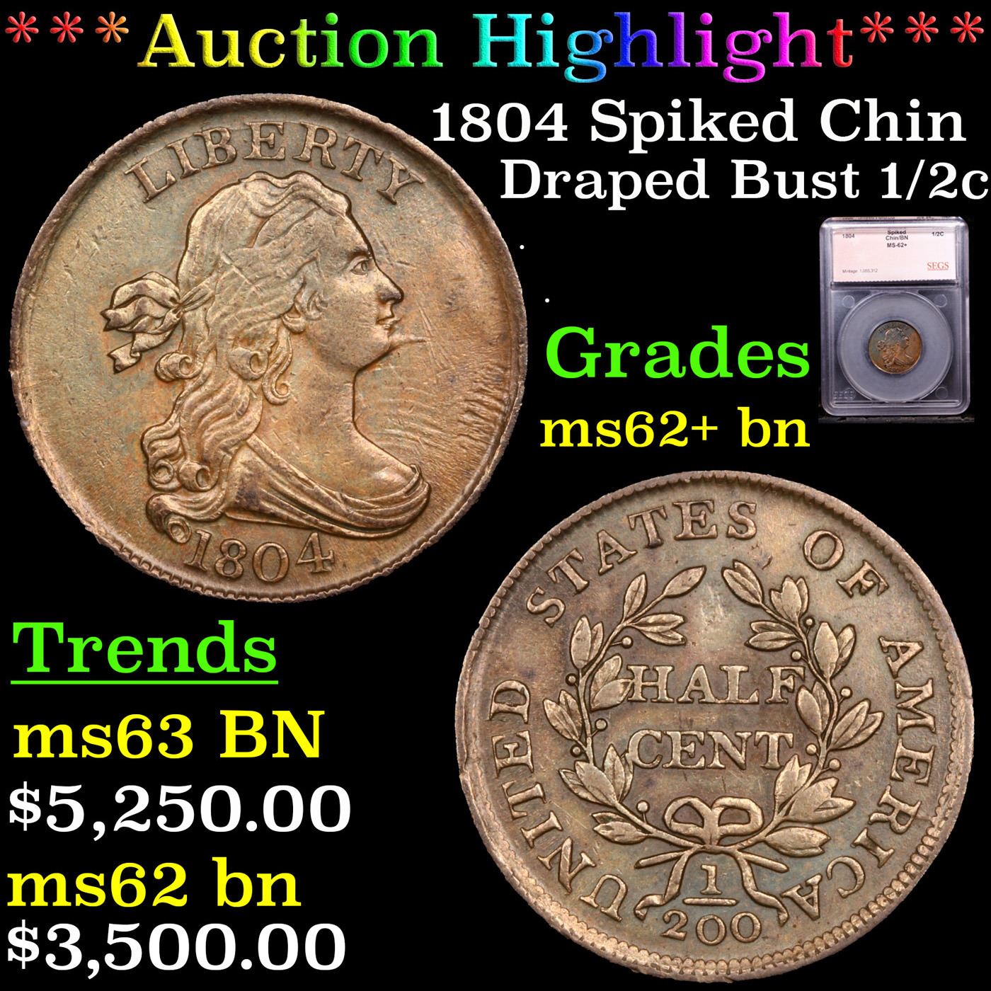***Auction Highlight*** 1804 Spiked Chin Draped Bust Half Cent 1/2c Graded ms62+ bn By SEGS.