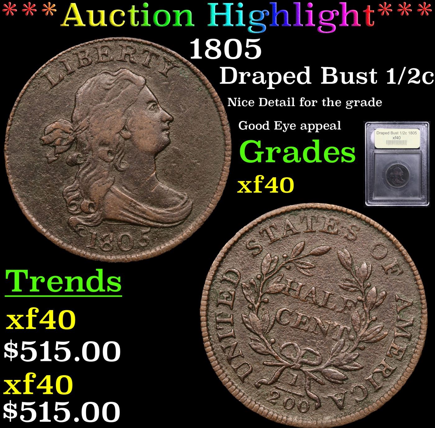 ***Auction Highlight*** 1805 Draped Bust Half Cent 1/2c Graded xf By USCG. A Corey's Pick, Bid to Win Coin