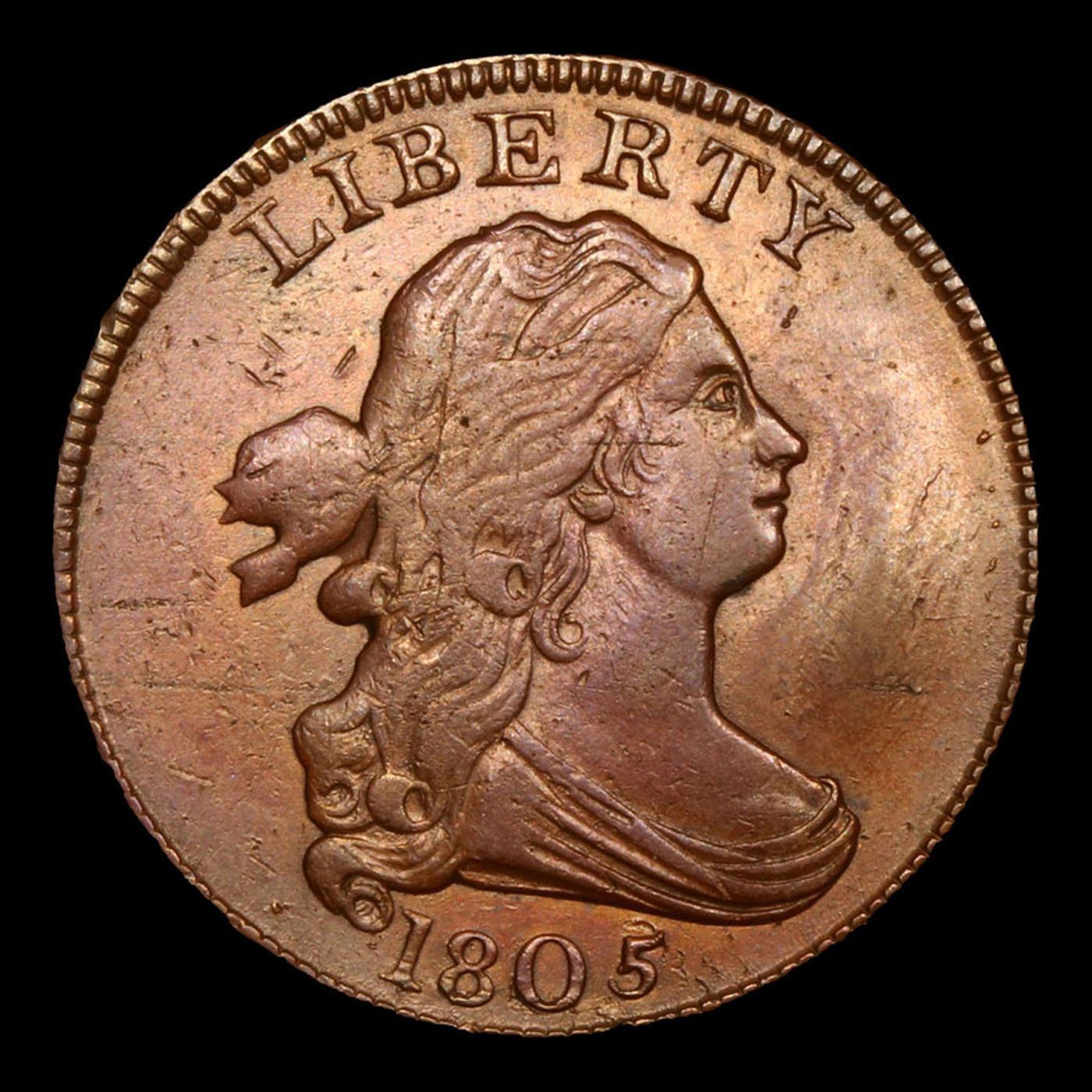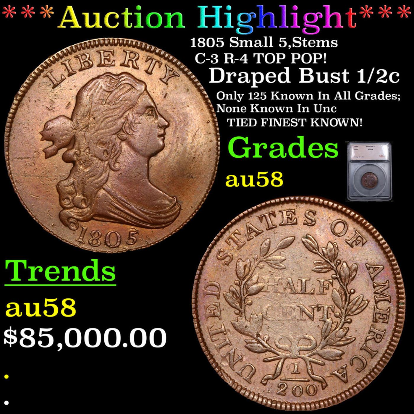 ***Auction Highlight*** 1805 Draped Bust Half Cent Small 5,Stems C-3 R-4 TOP POP! 1/2c Graded au58 B