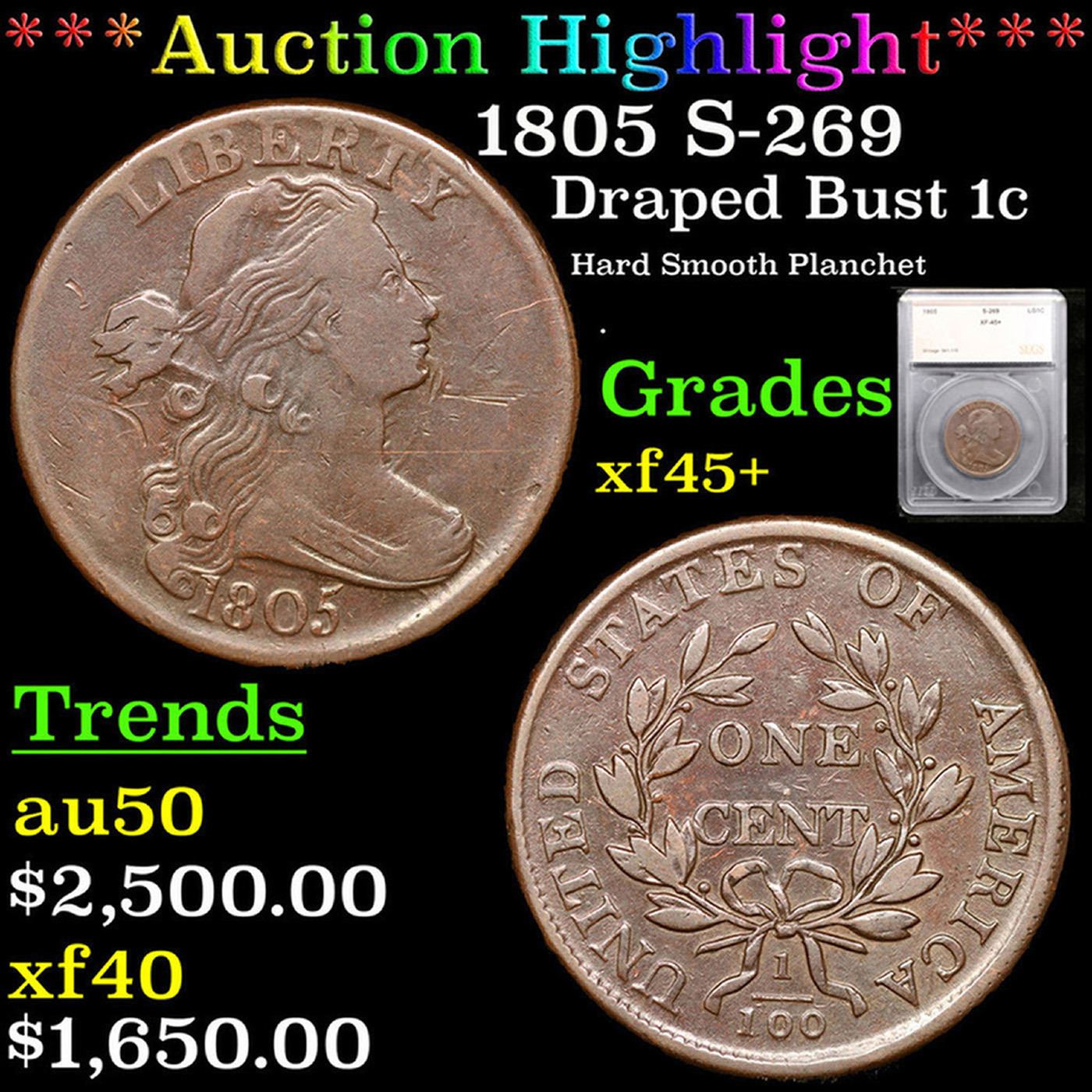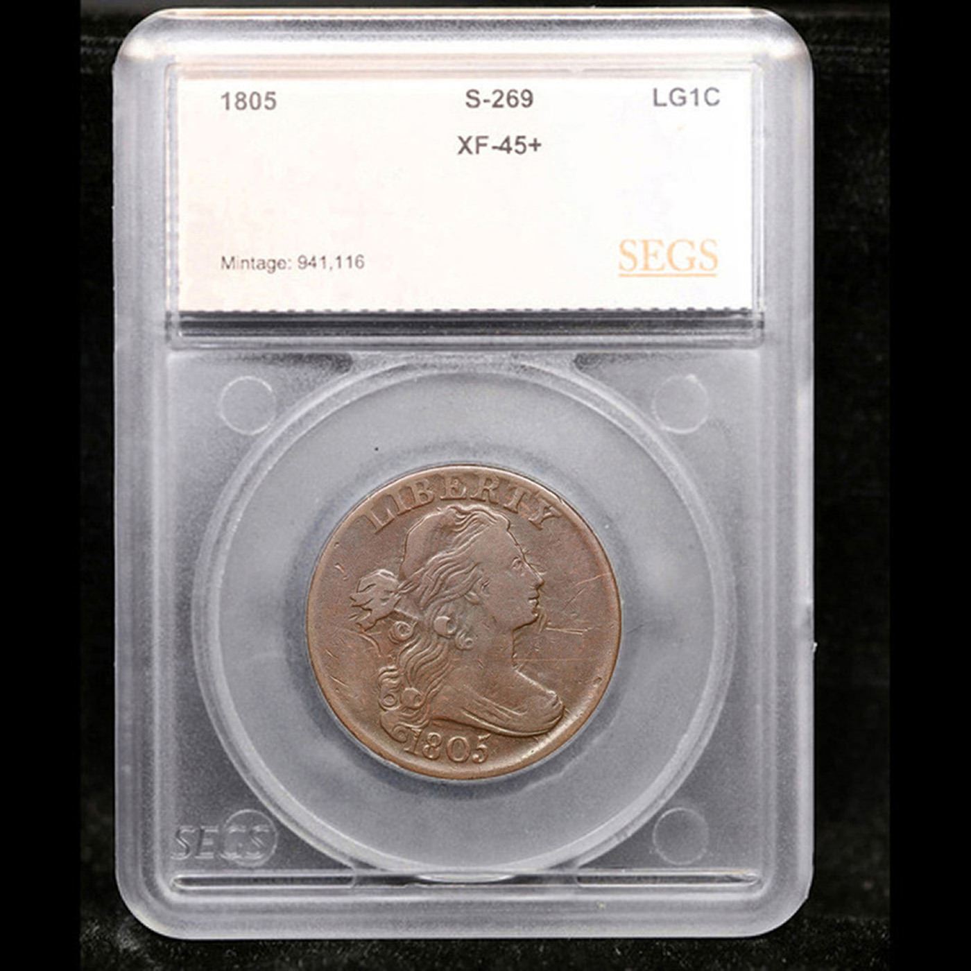 ***Auction Highlight*** 1805 S-269 Draped Bust Large Cent 1c Graded xf45+ By SEGS. A Key Date's Pick, Bid to Win Coin