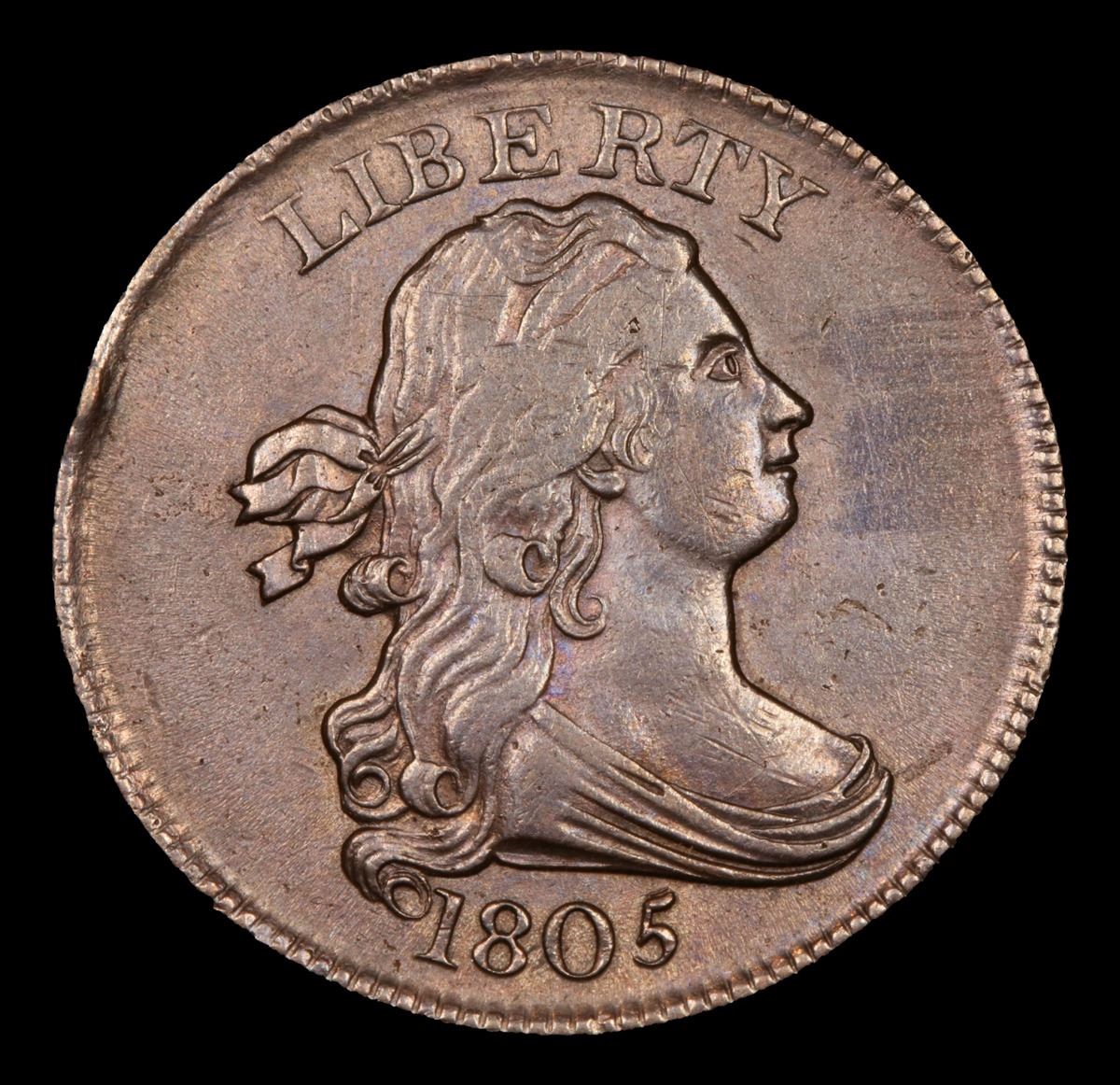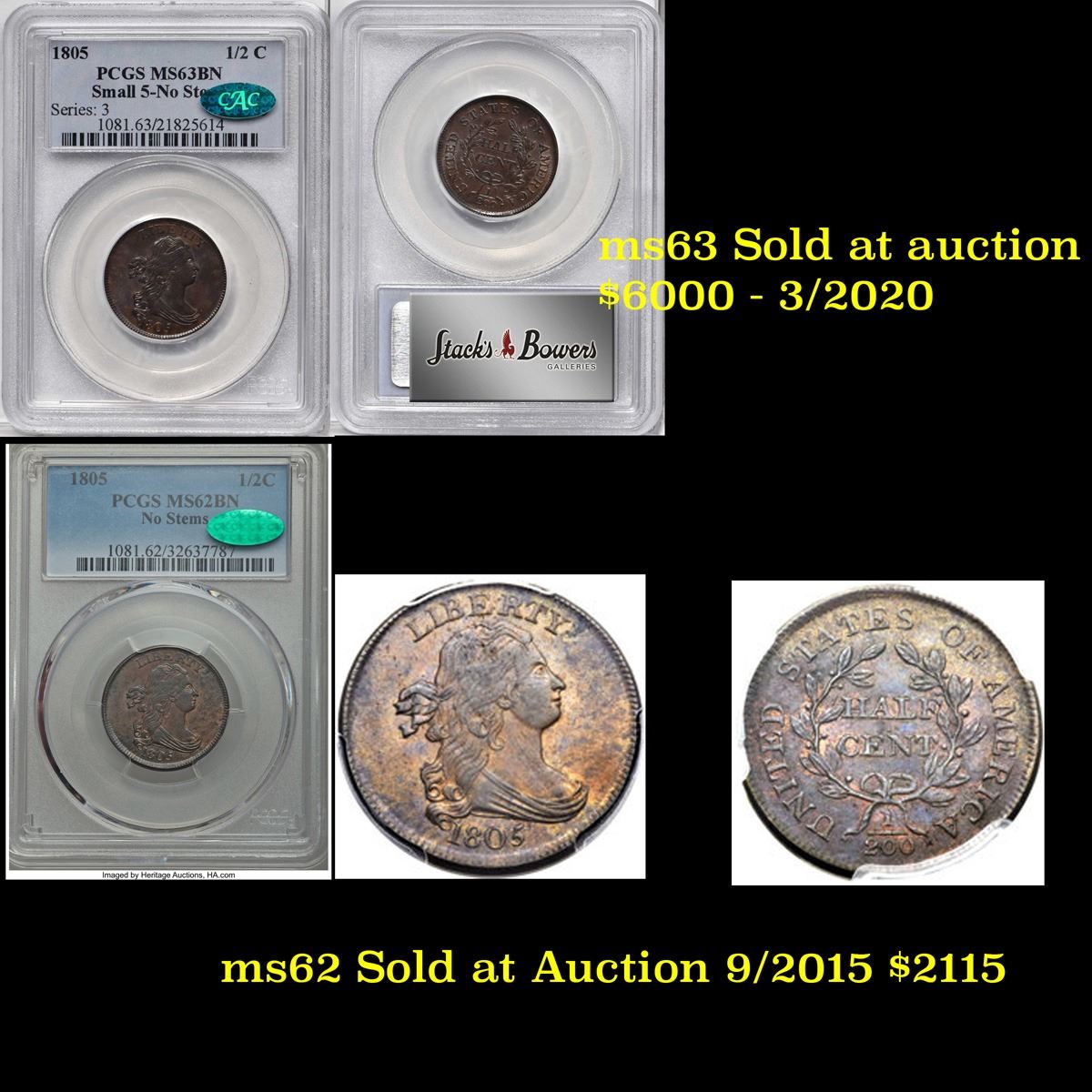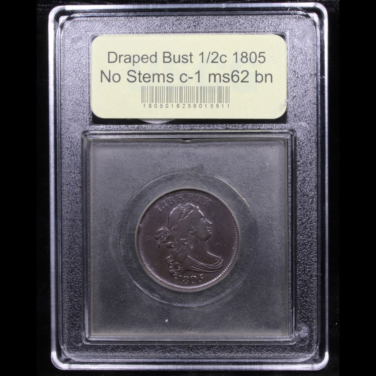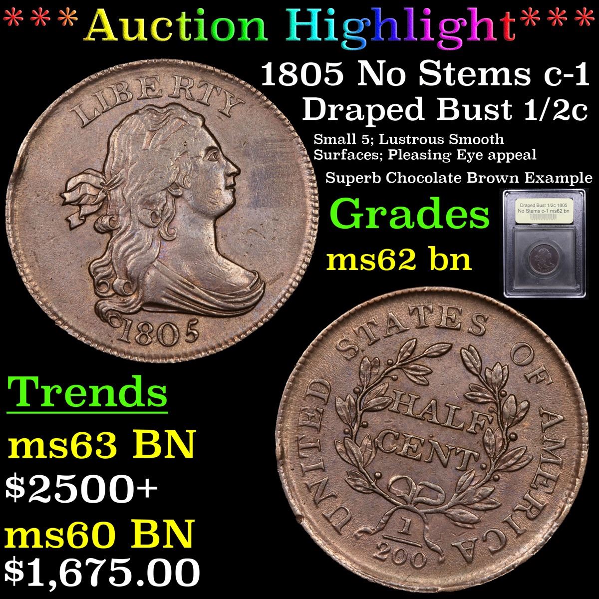 ***Auction Highlight*** 1805 No Stems c-1 Draped Bust Half Cent 1/2c Graded Select Unc BN By USCG. Up for Auction is a Superb Chocolate Brown Example of the 1805 Half Cent in Uncirculated Condition. The Cohen 1 Variety, No stems. The Cohen 1 is the only variety that qualifies as a no stem variety. It has the strongly recut 5 in the date. It is the Manley Die State 1.0 with a small break in the reverse dentils near 6 O'clock. Lustrous smooth surfaces, highlight this chocolate brown example. Pleasing eye appeal and well struck devices with only weakness in isolated areas, which is typical for the issue. I have included two examples, both a PCGS ms62 and a PCGS ms63 for your comparison. I think you will agree ours is equal to the ms63 and superior to the ms62. Good Luck in obtaining this choice example. A Corey's Pick, Bid to Win, Don't let it get Away Coin