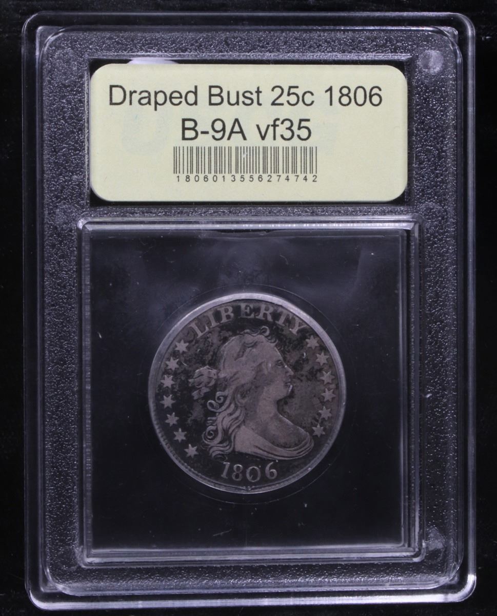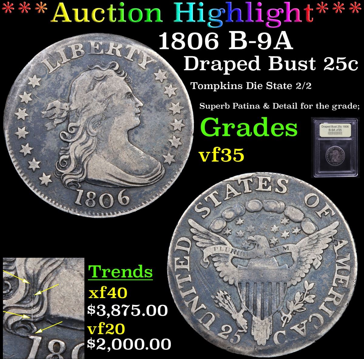 ***Auction Highlight*** 1806 B-9A Draped Bust Quarter 25c Graded vf++ By USCG. Up for Auction is a very scarce 1806 Draped Bust Quarter Dollar, Tompkins Die State 2/2. This is a beautiful original example with superb patina and superb detail for the grade. The example is the Browning 9A, which appears to have the star further from the curl than it actually is. If examined with a loup you will find the hair curl behind the head and below the E are present, they just failed to pop. The 9A is not an “Official” variety, but is listed by Browning a a separate listing. The coin is struck from an early state of the dies before any die clashing, but not before the obverse cracked vertically from the rim to 1 in the date, through Liberty's hair, to the E in LIBERTY. The reverse represents the earliest known state of the die, with a rim cud above AT in STATES. Later die stages show additional cracks, die clashing, and die lapping. The Draped Bust Quarter was produced in limited numbers and erratically during the earliest years of U.S. Mint operations, the quarter was not a popular denomination with contemporary silver bullion depositors. Such coins were produced at the request of depositors during the late 18th and early 19th centuries, and those dealing in silver bullion much preferred half dollars and silver dollars over quarters. Trends on this great example are xf40 $3850 and vf30 $2,000 A Corey's Pick, Bid to Win, Don't let it get Away, you might not find its equal Coin