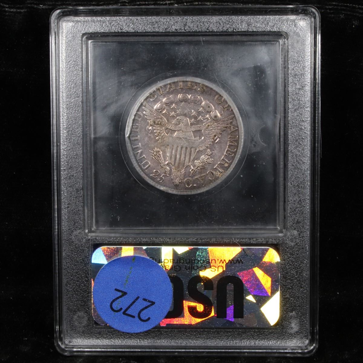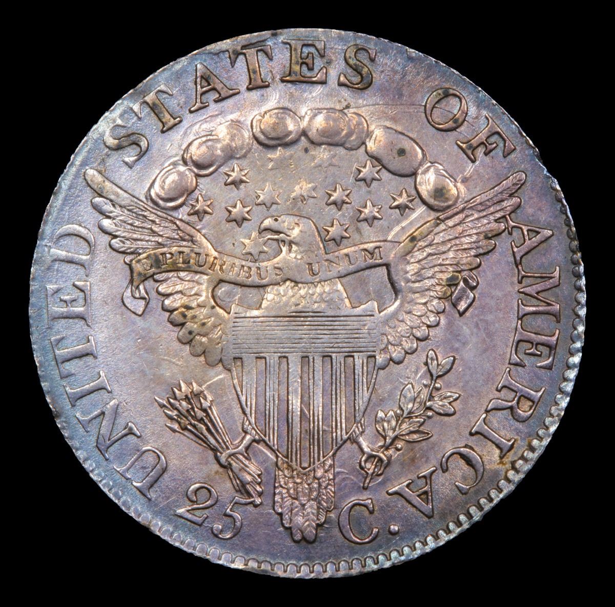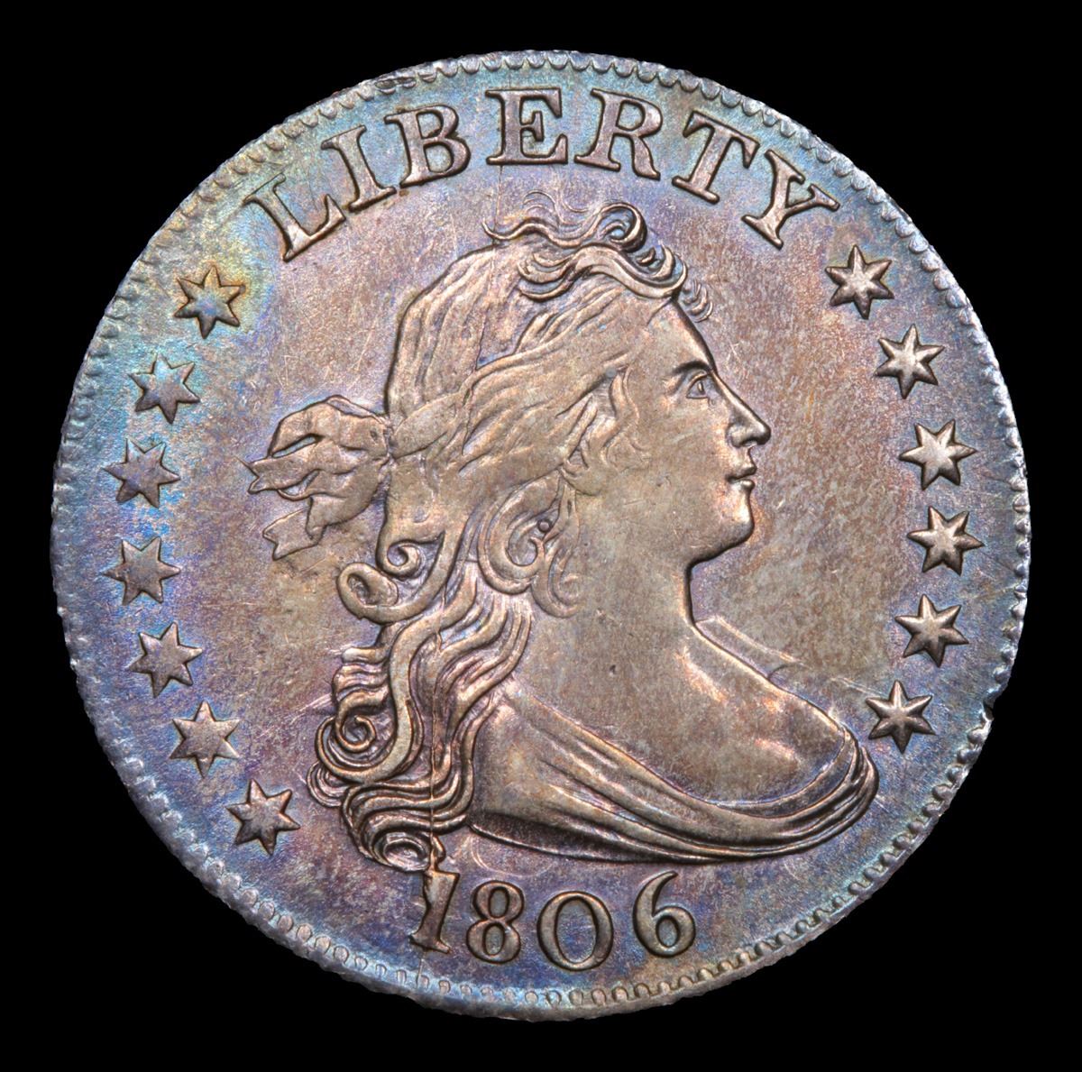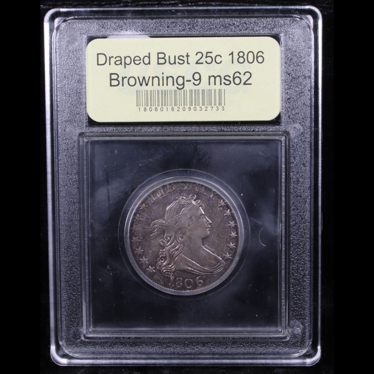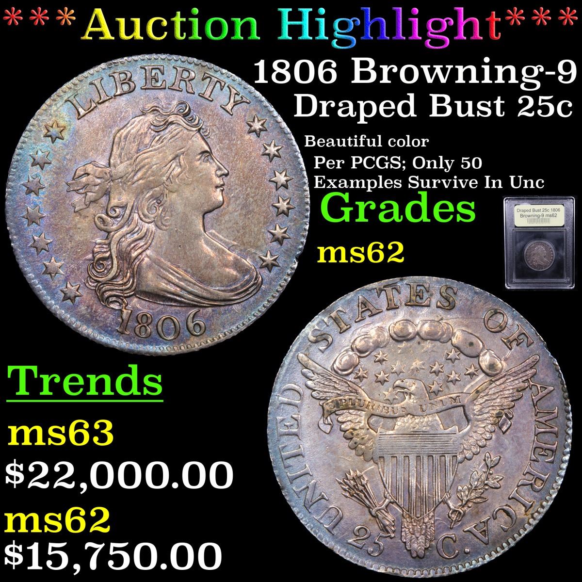 ***Auction Highlight*** 1806 Browning-9 Draped Bust Quarter 25c Graded Select Unc By USCG. Wisps of apricot, gunmetal-gray, and sky-blue color grace this unmarked and impressive Draped Bust Quarter. The motifs are overall well struck and boldly rendered. The surfaces are largely pristine, a planchet flaw at the rim above the letter T in LIBERTY and a few light striations over Liberty's portrait are as made. Characteristic (for the B-9 variety) die cracks are evident on both sides, with a noteworthy rim cud also present at 12 o'clock on the reverse. This outstanding early quarter would serve as a highlight in even the finest numismatic cabinet. Now a mainstay denomination familiar to all, this was not the case for the quarter dollar in the beginning. The denomination was first struck four years after it was authorized by the Mint Act of 1792 and, possibly due to lack of demand from bullion depositors, was not struck again until 1804. Robert Scot's Draped Bust Heraldic Eagle design was utilized beginning in that year and the mintage barely exceeded that of 1796. A Corey's Pick, Bid to Win, Don't let it get Away, you might not find its equal Coin. I give this coin my highest recommendation