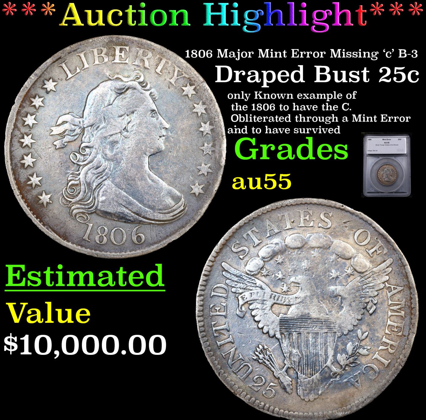 ***Auction Highlight*** 1806 Major Mint Error Missing 'c' B-3 Draped Bust 25c Graded au55 BY SEGS. Major Mint Error. Struck Through Grease on the Reverse and the ‘C.’ has been obliterated. It is the Browning 3 Variety with the Broken T in Liberty on the Obverse and on the Reverse as can be seen on the Eric P. Newman Example, and is the Latest Die State with the Damaged Shied Reverse. The Example at hand is the only Known example of the 1806 to have the C. Obliterated through a Mint Error and to have survived. The Value of this ULTRA rarity is untested at this date as this incredibly rarity has NEVER come to auction. Trends on a normal Browning 3 in au58, is $7,900. A Corey's Pick, Bid to Win, Don't let it get Away, you might not find its equal Coin. I give this coin my highest recommendation