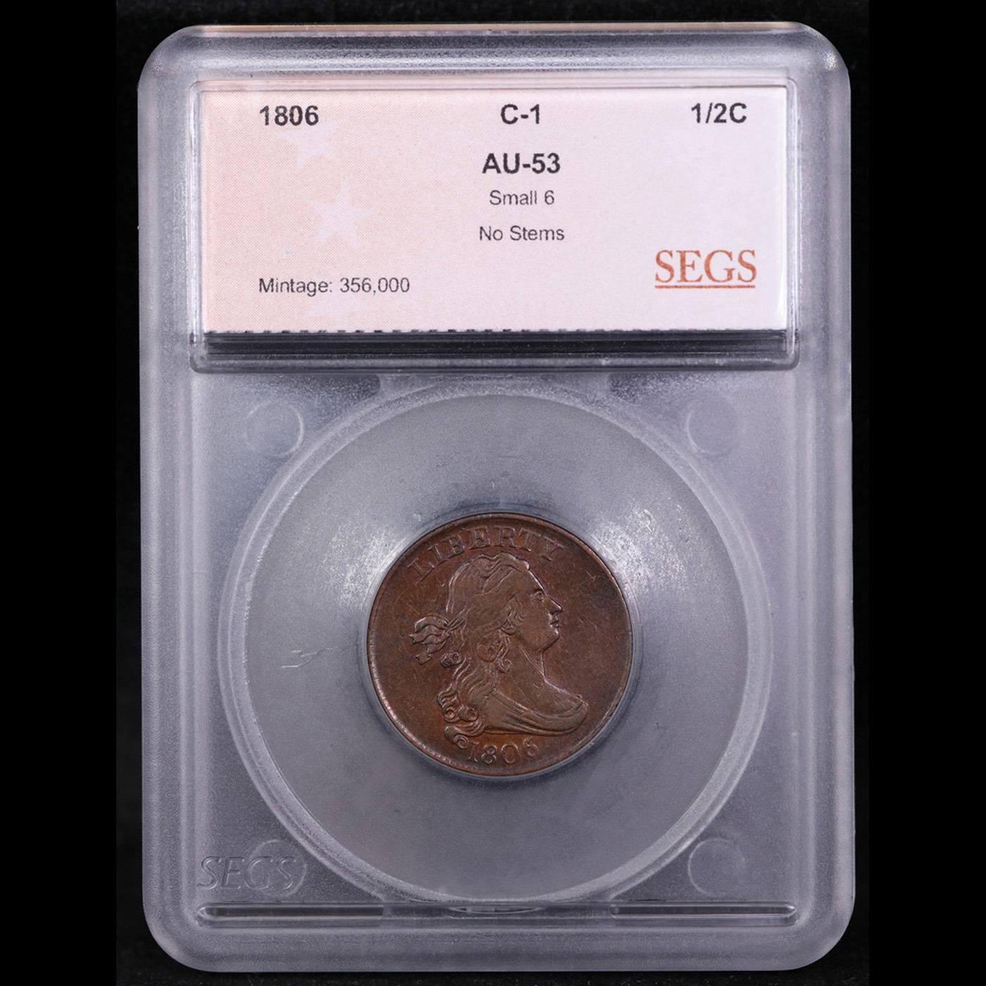 ***Auction Highlight*** 1806 Small 6 No Stems Draped Bust Half Cent C-1 1/2c Graded au53 BY SEGS (fc