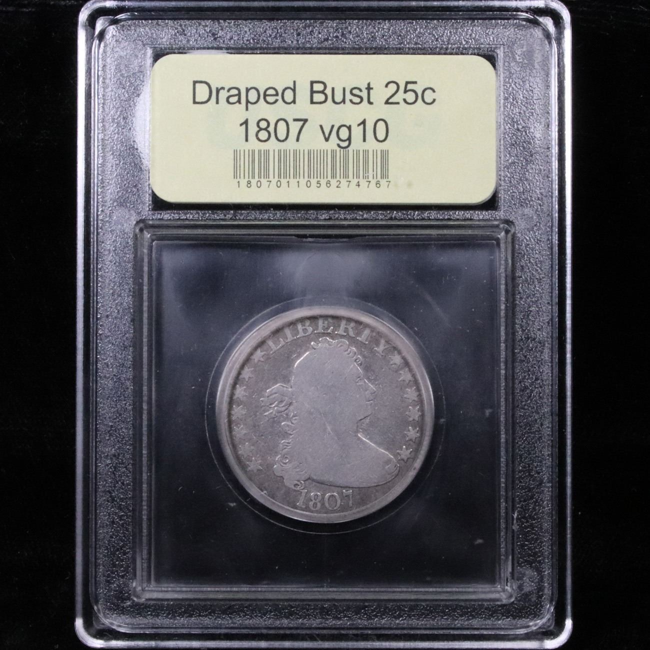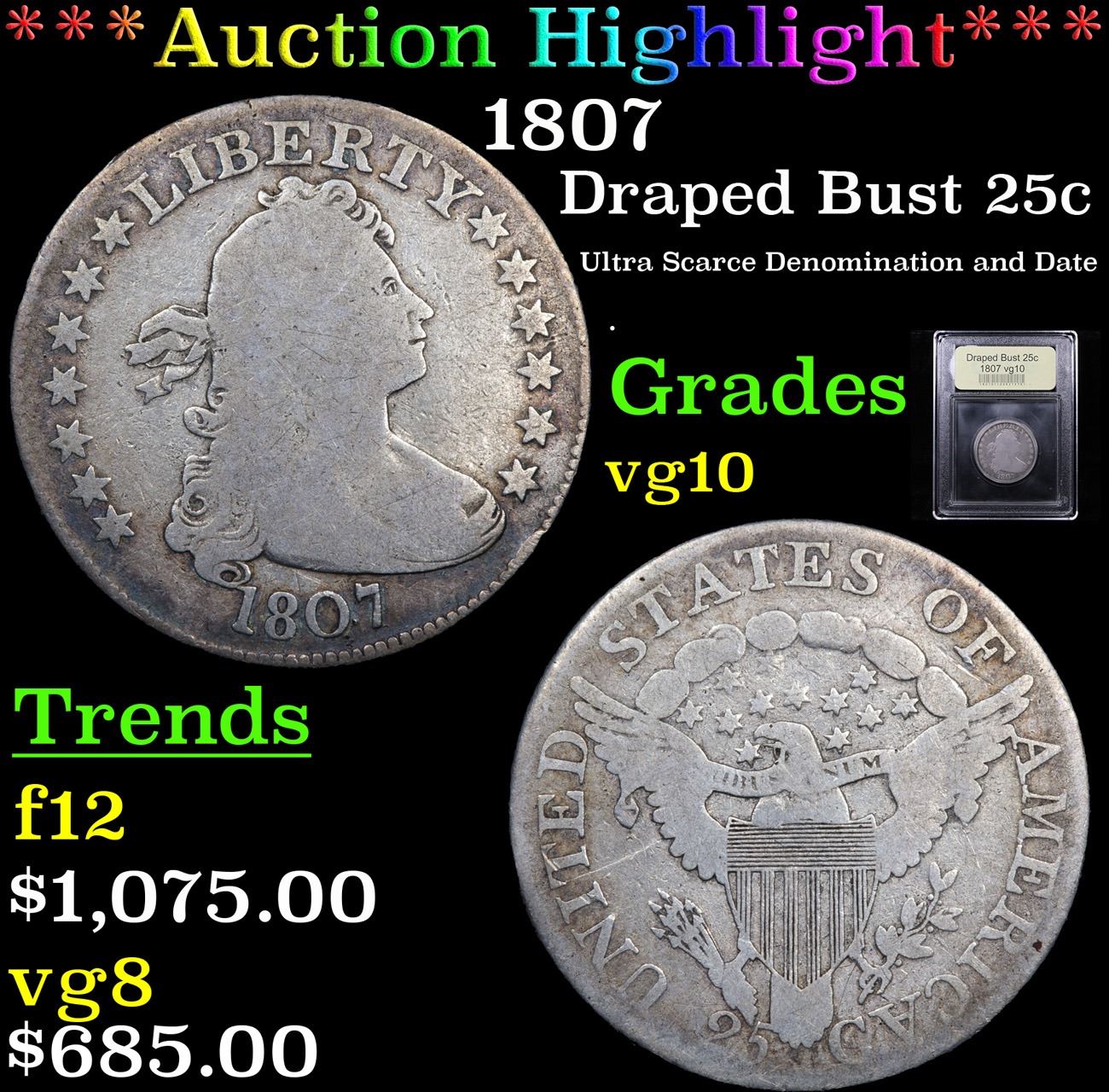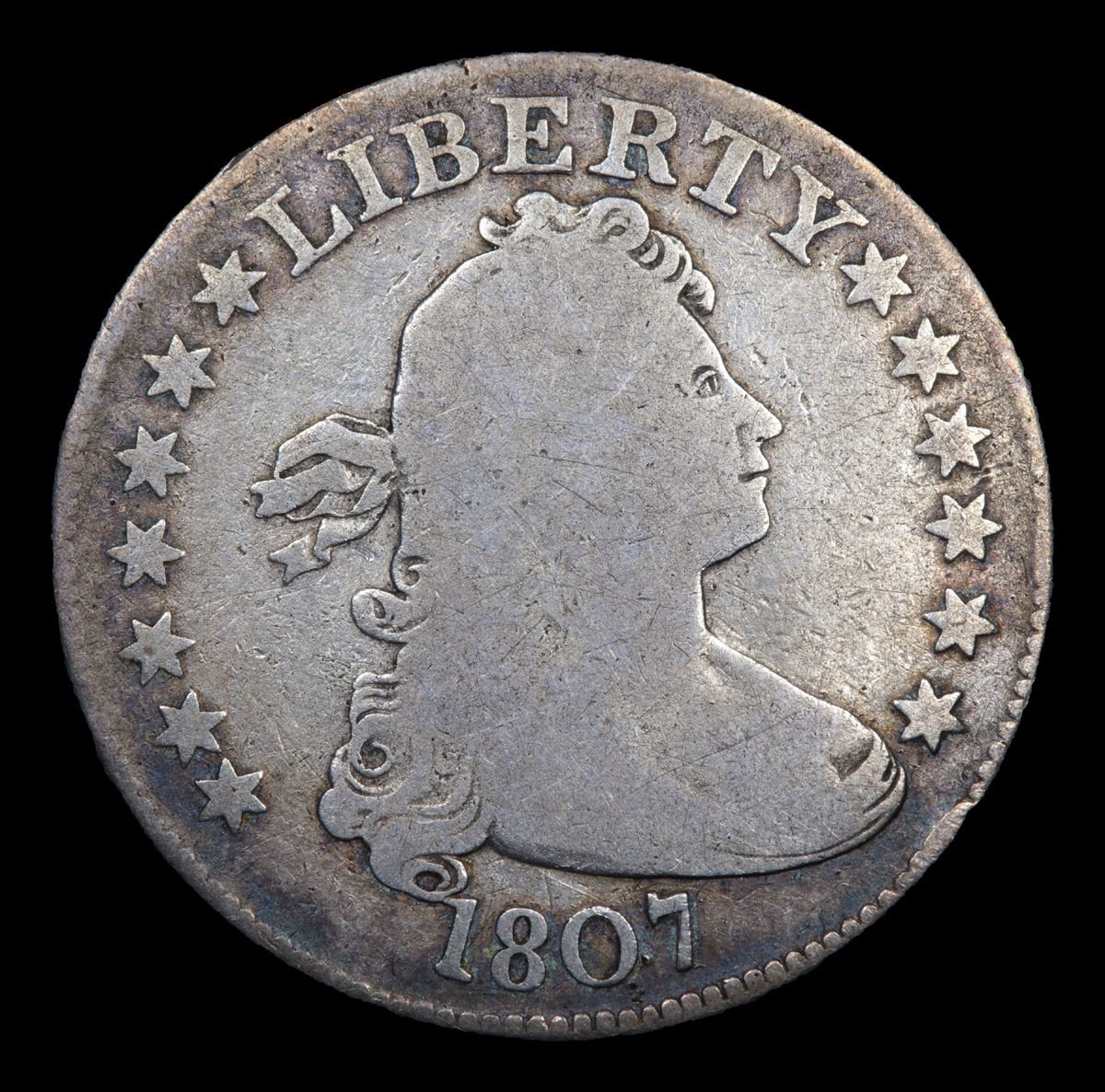 ***Auction Highlight*** 1807 Ultra Scarce Denomination and Date . Draped Bust Quarter 25c Graded vg+ By USCG. A Corey's Pick, Bid to Win Coin