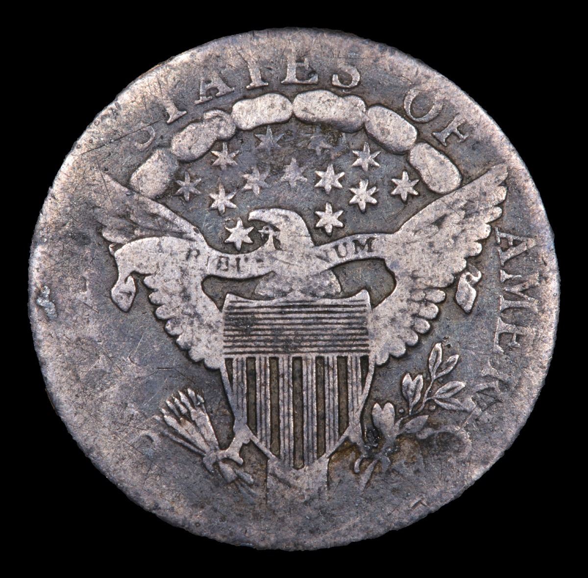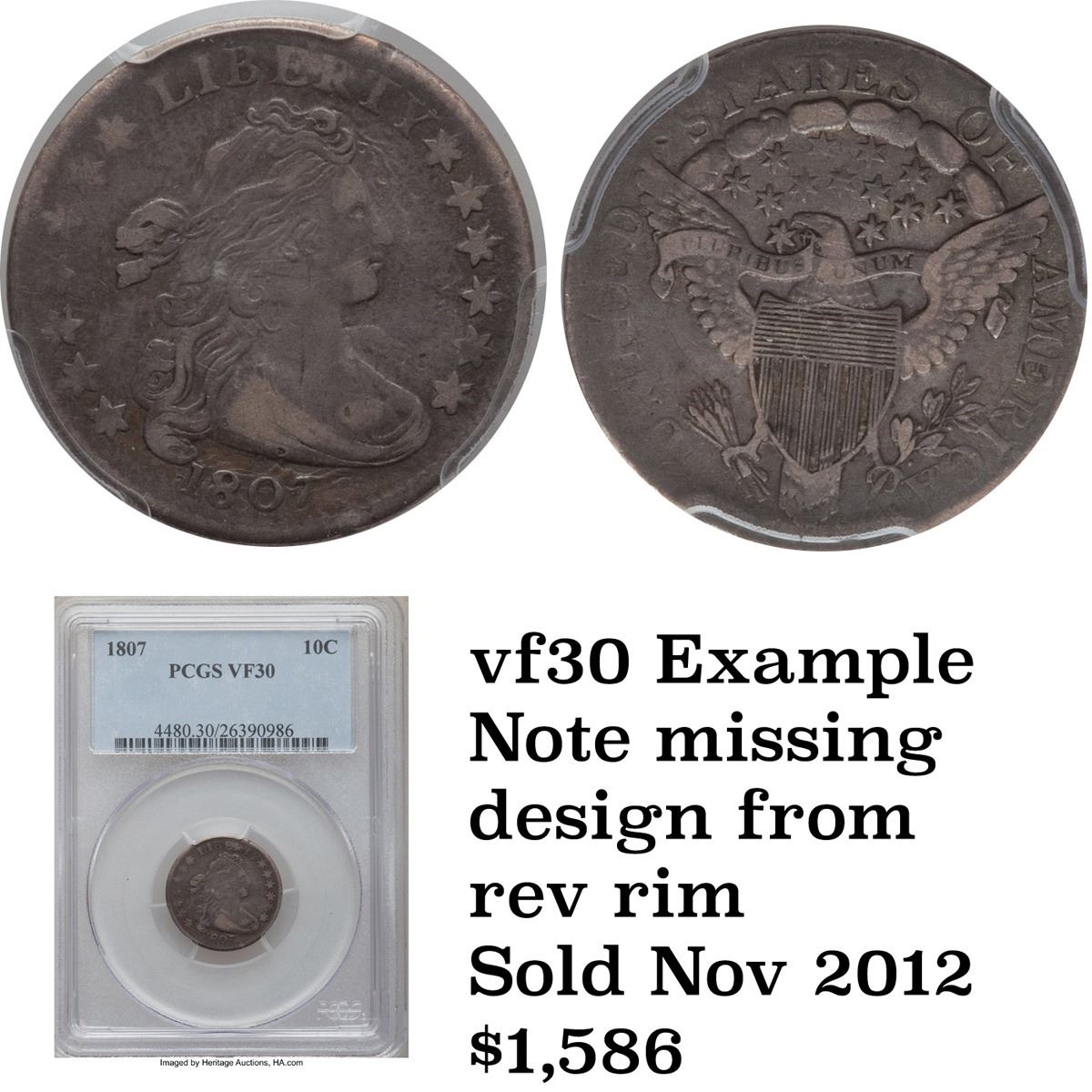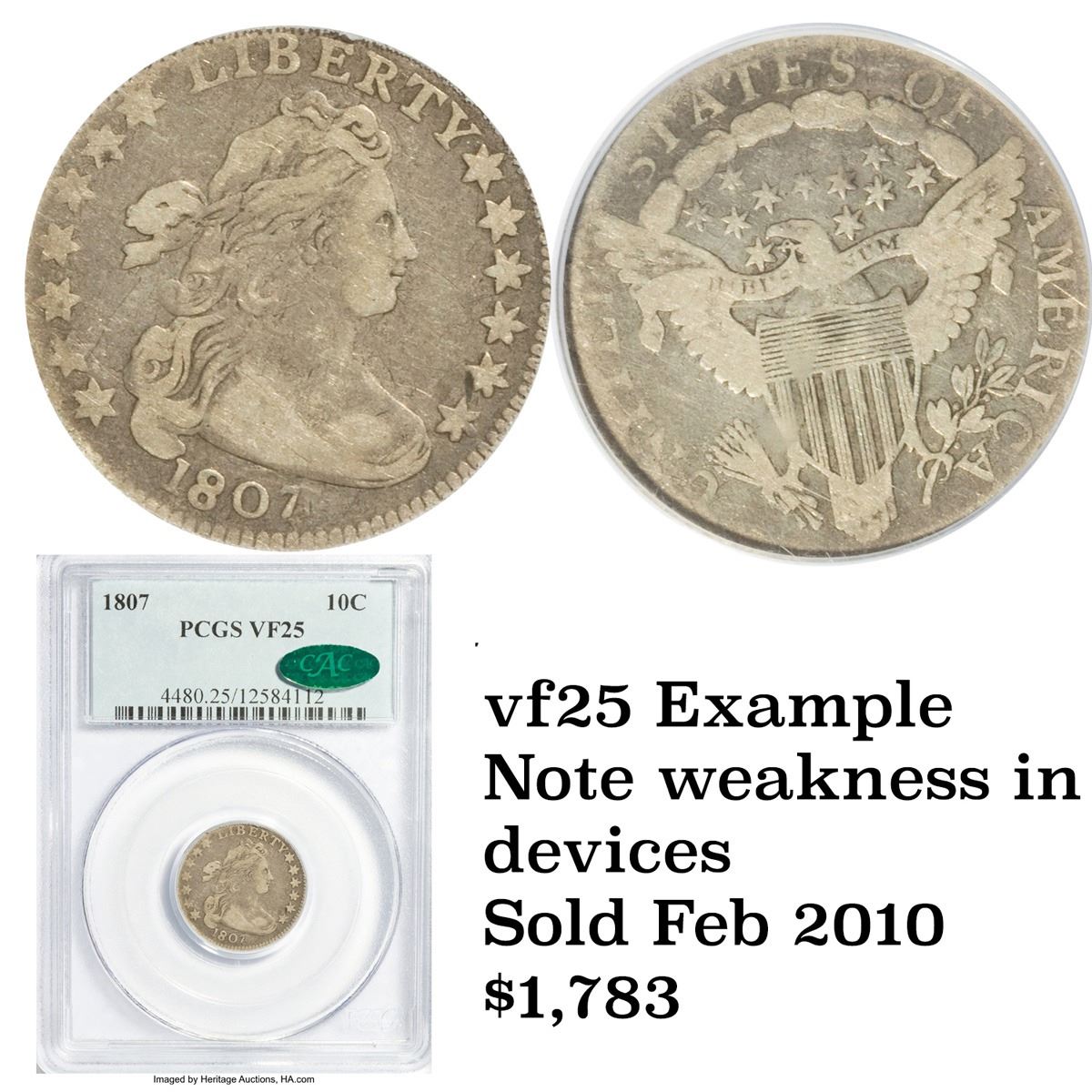 1807 Draped Bust Dime. JR-1, the only known dies. The final year 1807 is a perennial favorite among collectors seeking a single example to represent the Draped Bust, Heraldic Eagle design type of 1798 to 1807. From an approximate mintage of 165,000 pieces approx. 1,000 survivors are believed extant in all grades. The only known variety of this issue features a workhorse reverse die that the Mint also used to strike a number of varieties in the Capped Bust Right quarter eagle (!) series: 1805 BD-1; 1806/4, Stars 8x5 BD-1; 1806/5, Stars 7x6 BD-2; 1807 BD-1. Such was the benefit of not including the denomination as part of the design and allowing only the size of the coin and its precious metal content to determine value in commerce. The use of a single reverse die to strike similarly sized coins of different denominations was a particularly ingenious saving of time and labor. In theory, Heraldic Eagle half dollar and $10 gold dies could have been interchanged, but no such examples have ever been found. I have given two PCGS examples for your comparison. Note in both the vf25 and the vf30, the moto on the reverse is missing. This is an intrinsic aspect of the issue. Based on these PCGS examples, I think a vf25 or vf30 grade is accurate. A Corey's Pick, Bid to Win, Don't let it get Away Coin