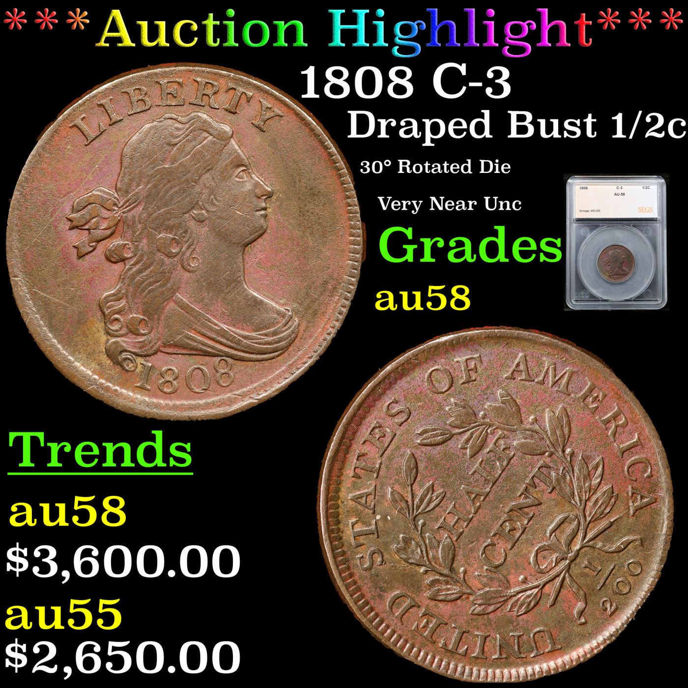 ***Auction Highlight*** 1808 C-3 Draped Bust Half Cent 1/2c Graded au58 By SEGS.
