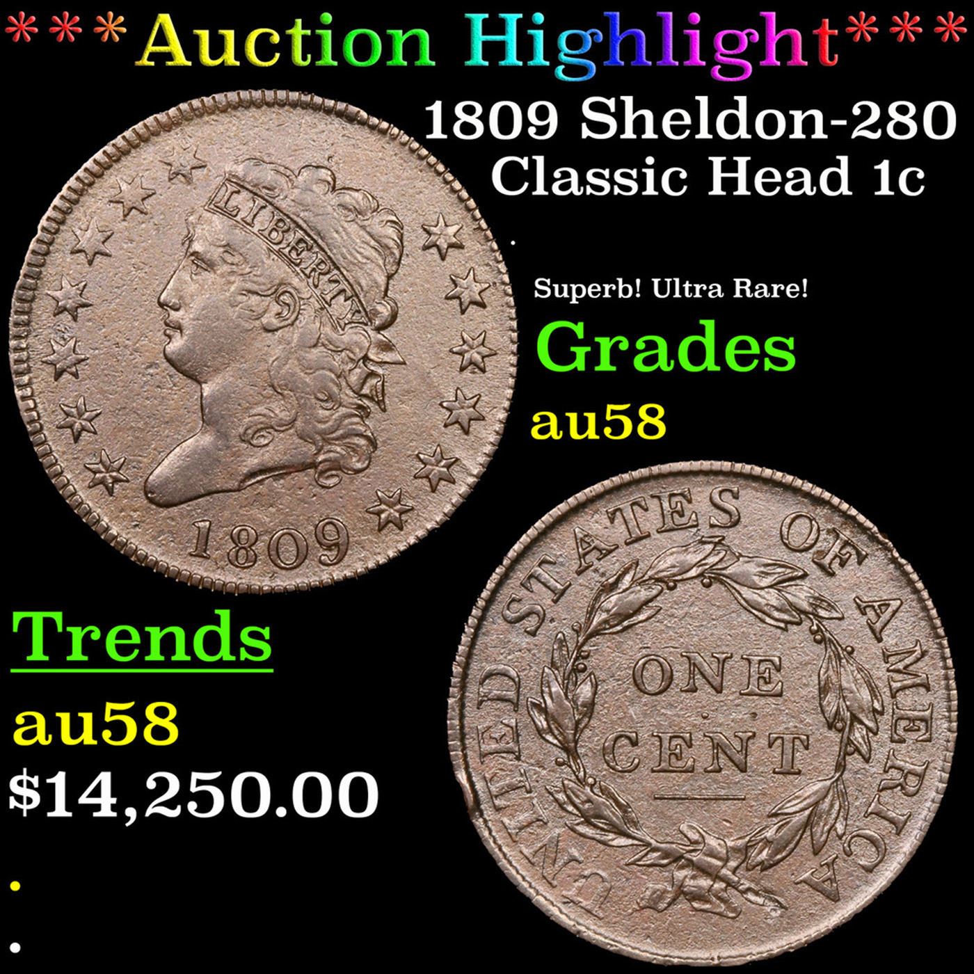 ***Auction Highlight*** 1809 Sheldon-280 Classic Head Large Cent 1c Graded au58 By SEGS. A Key Date's Pick, Bid to Win, Don't let it get Away Coin