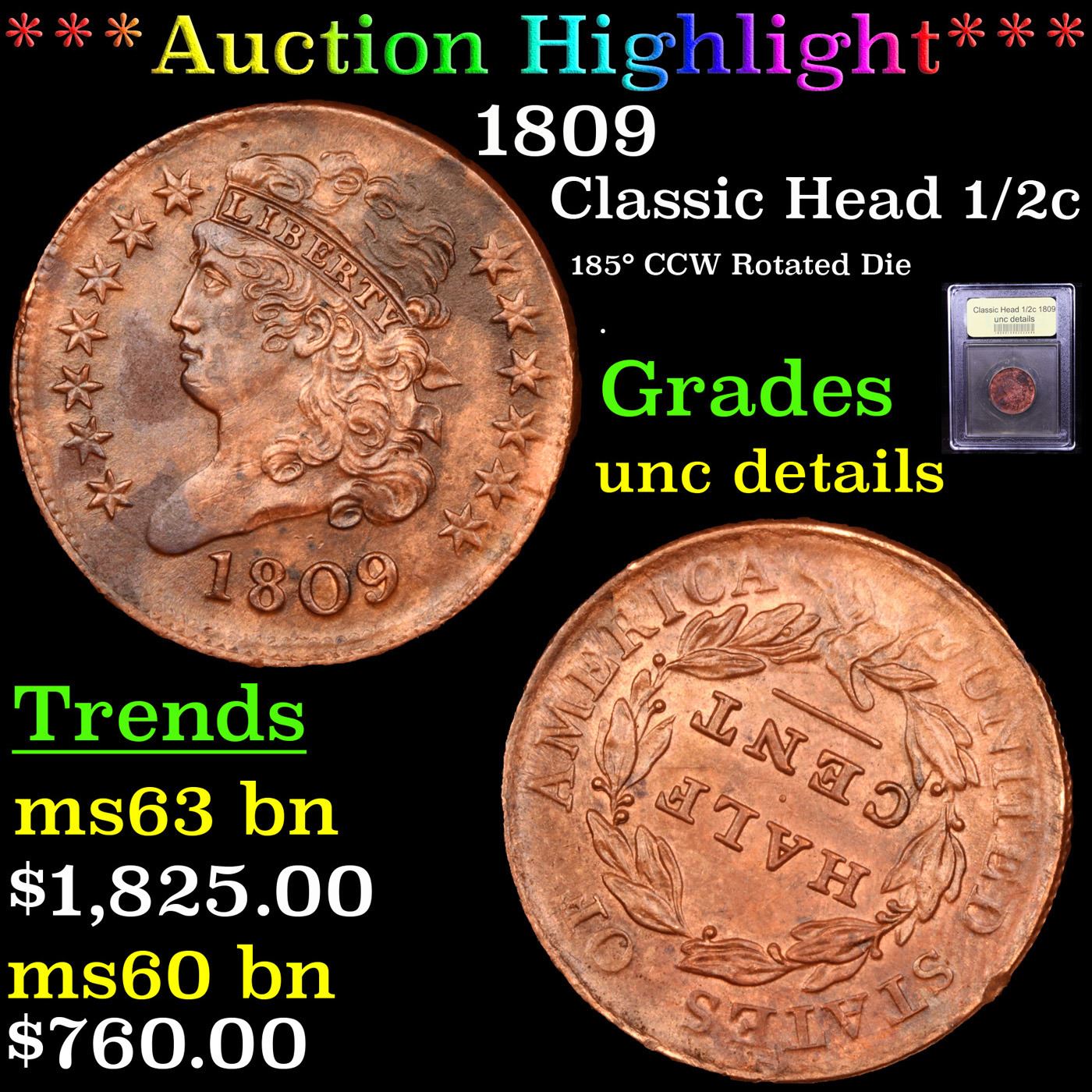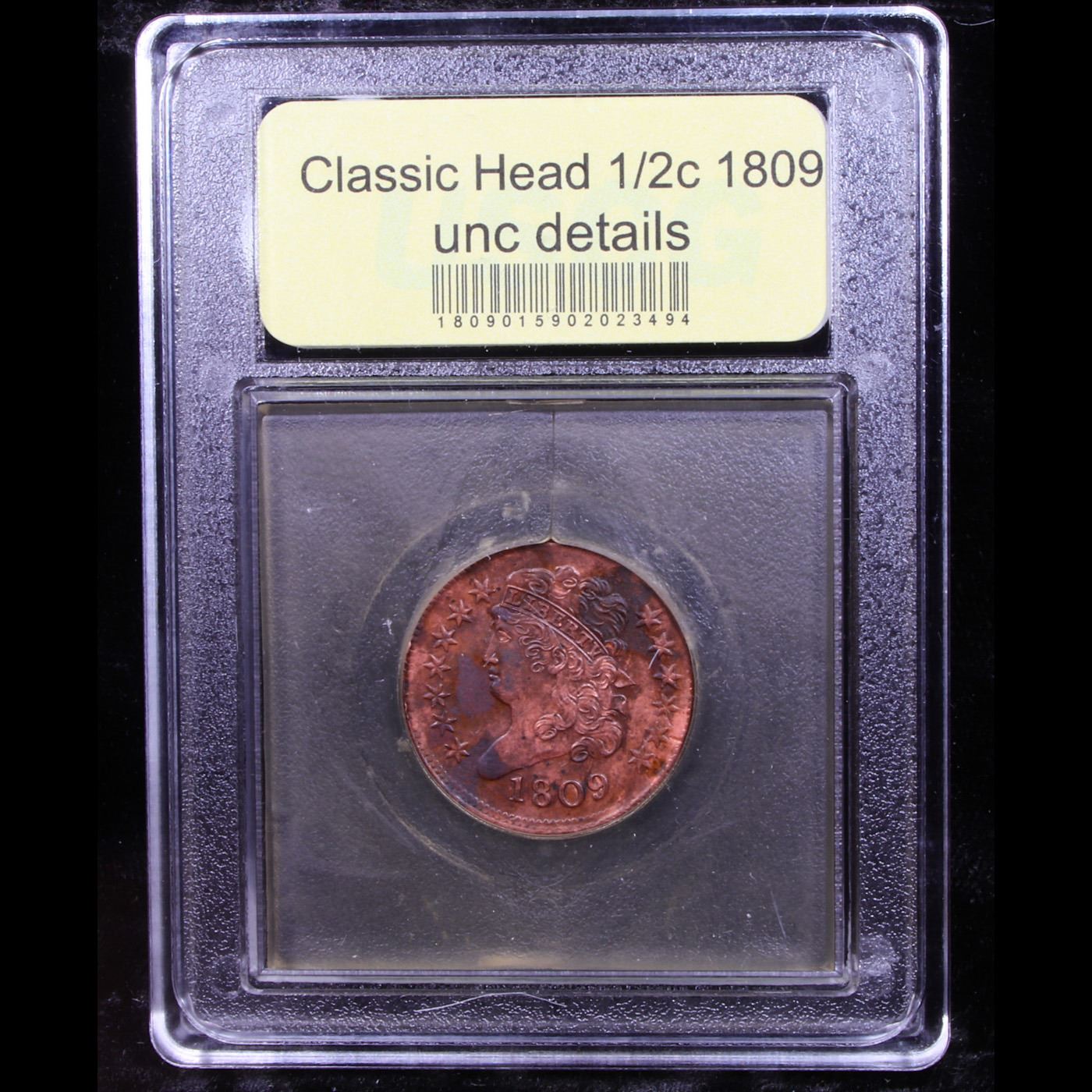 ***Auction Highlight*** 1809 Classic Head half cent 1/2c Graded Unc Details By USCG.