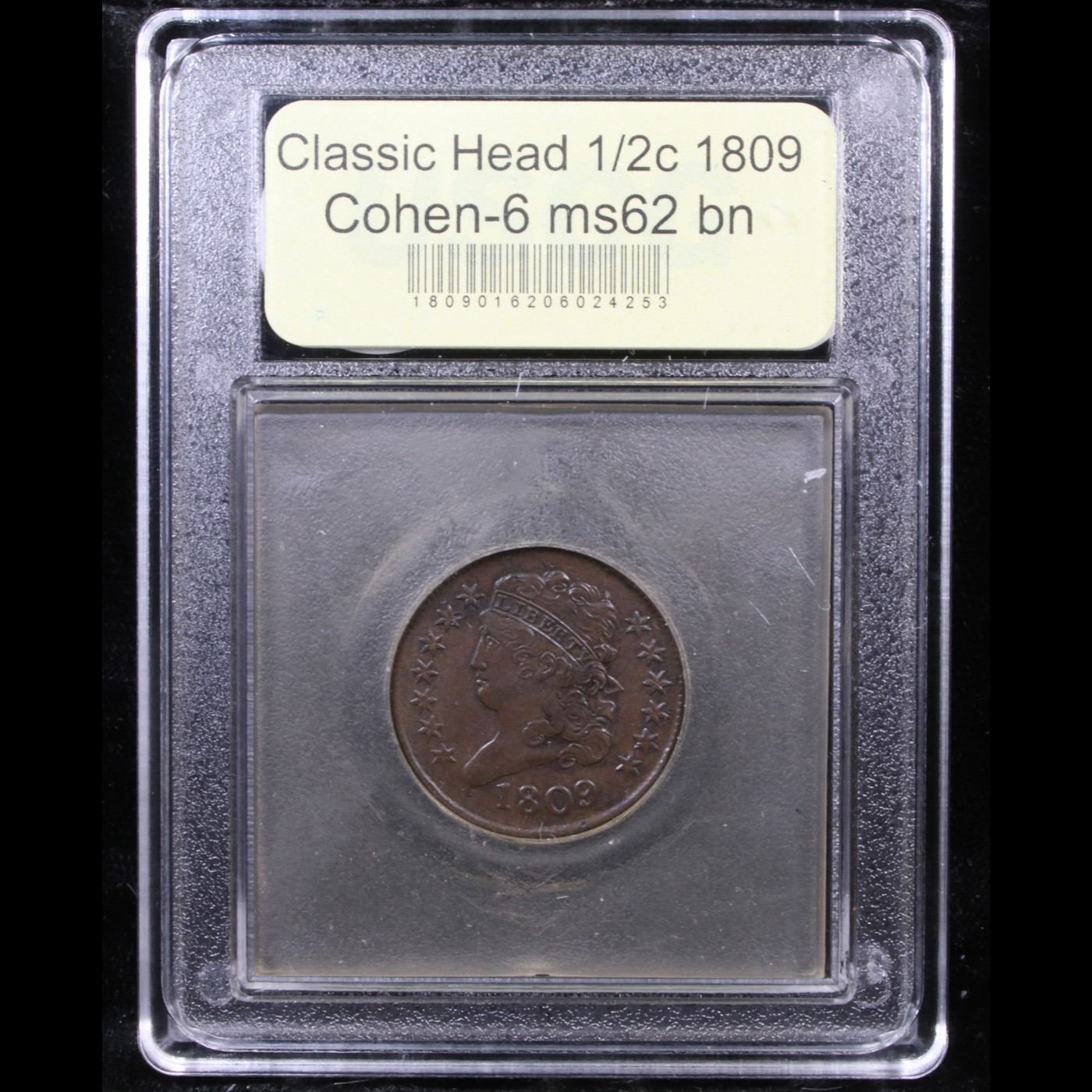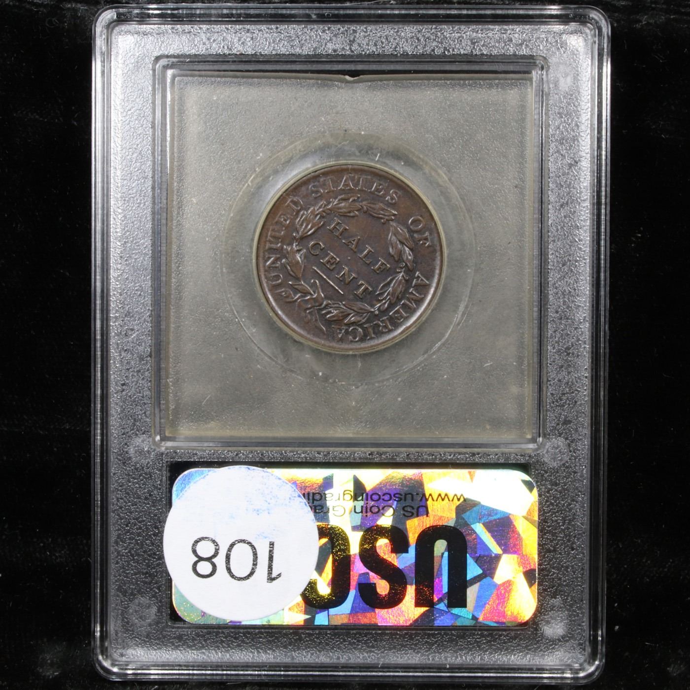 ***Auction Highlight*** 1809 Cohen-6 Classic Head half cent 1/2c Graded Select Unc BN By USCG. Attractive Chocolate brown color encompasses both sides of this terrific 1809 Half Cent. It is the Cohen 6 Variety, which can be easily identified by the top leaf on the reverse’ placement midway between the S in states and the OF. well struck for the variety. It also possesses a great 45 degree clockwise rotated die. A Corey's Pick, Bid to Win, Don't let it get Away, you might not find its equal Coin