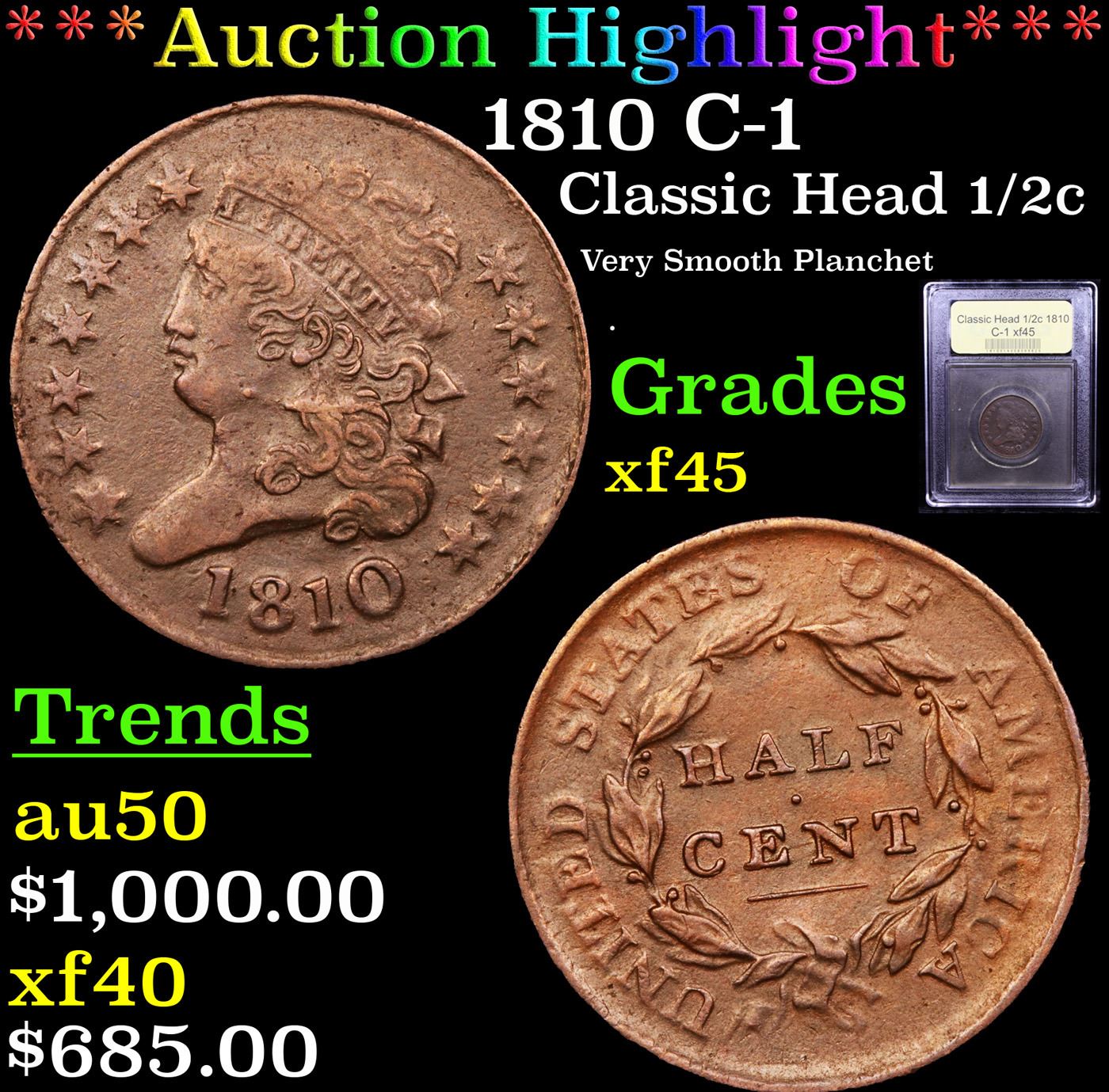 ***Auction Highlight*** 1810 C-1 Classic Head half cent 1/2c Graded xf+ BY USCG. A Corey's Pick, Bid to Win Coin