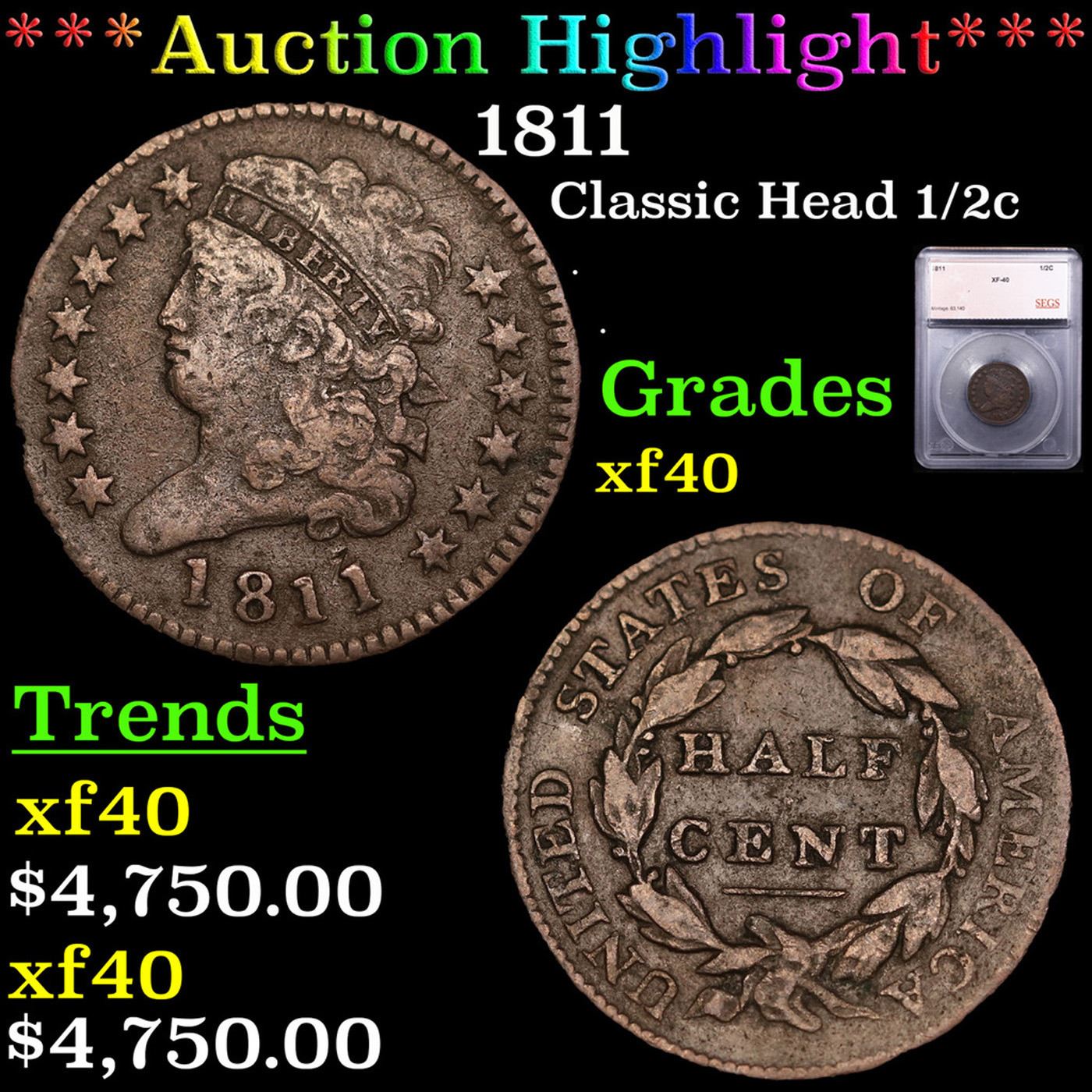 ***Auction Highlight*** 1811 Classic Head half cent 1/2c Graded xf40 By SEGS.