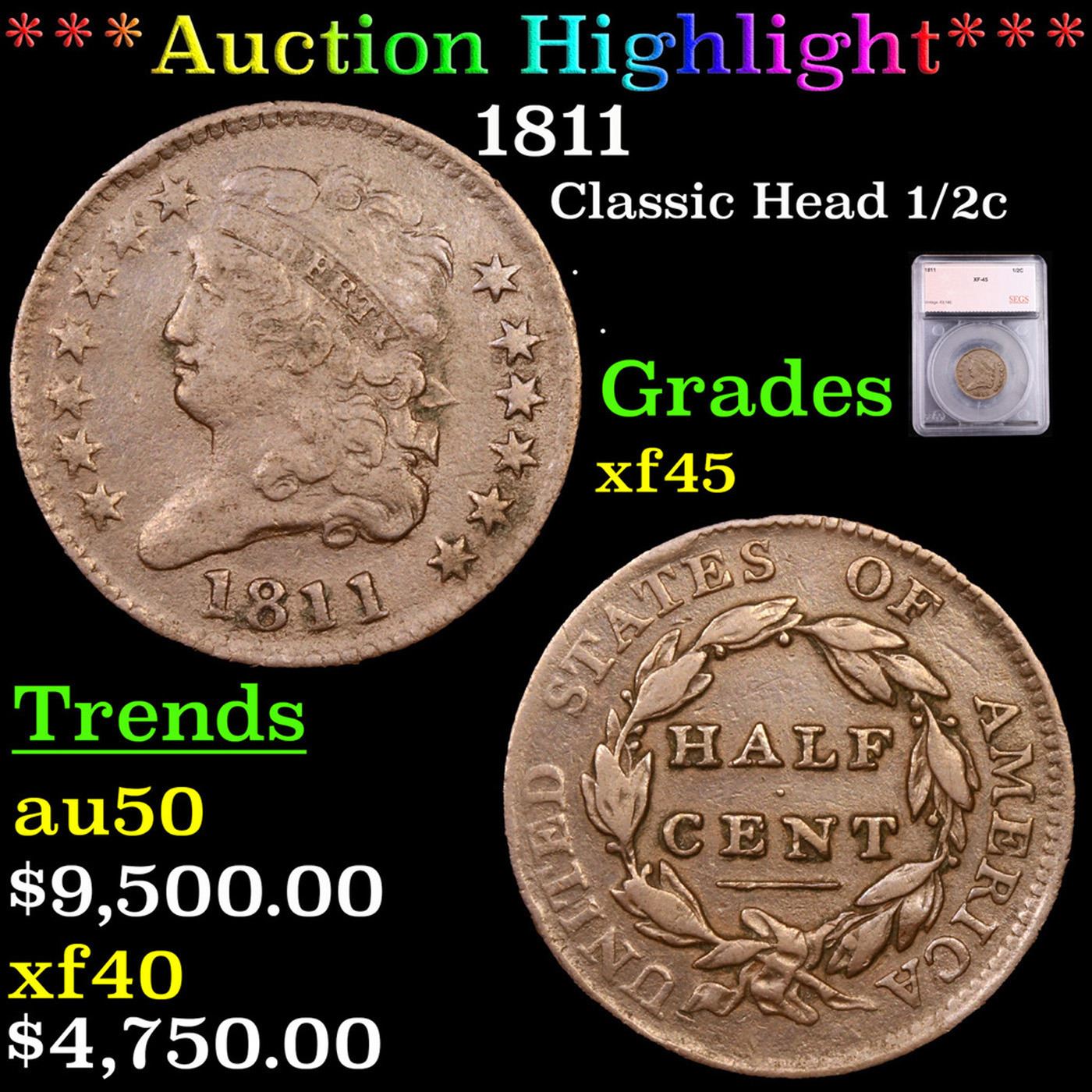 ***Auction Highlight*** 1811 Classic Head half cent 1/2c Graded xf45 By SEGS.