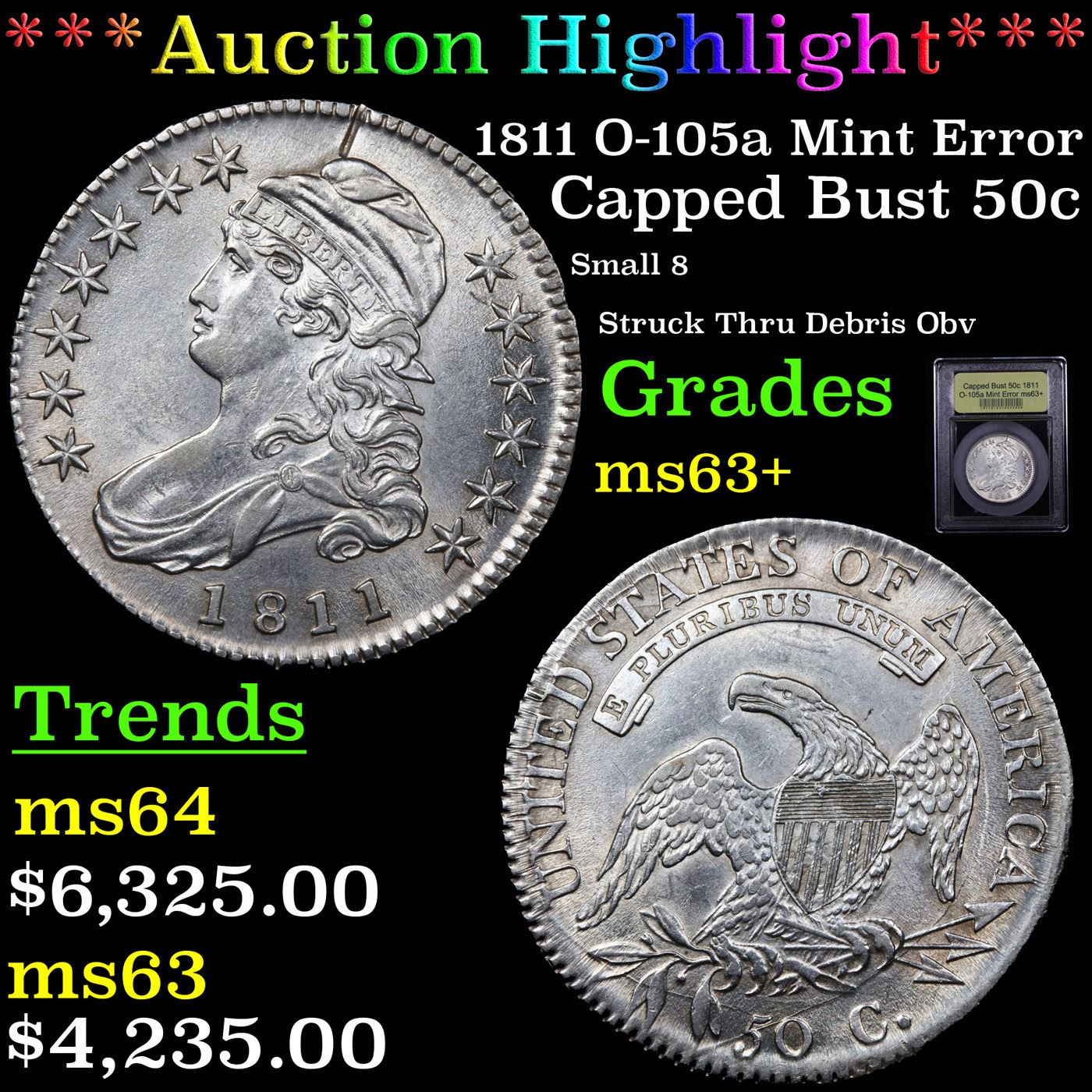 ***Auction Highlight*** 1811 O-105a Mint Error Capped Bust Half Dollar 50c Graded Select+ Unc By USC