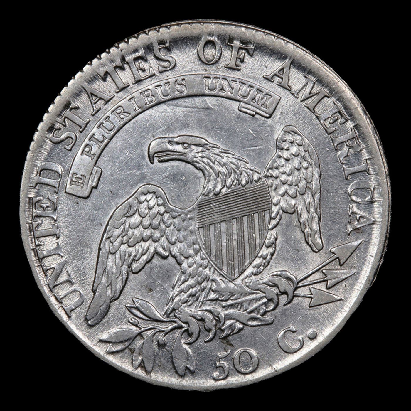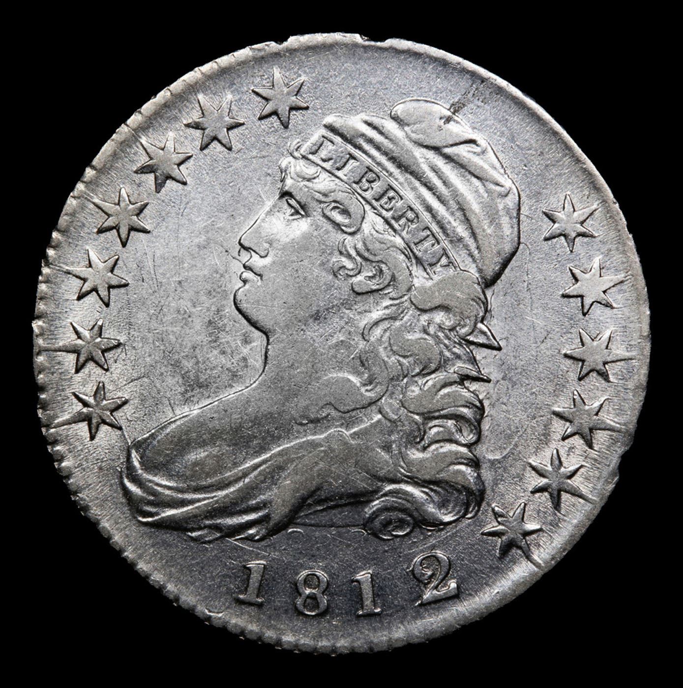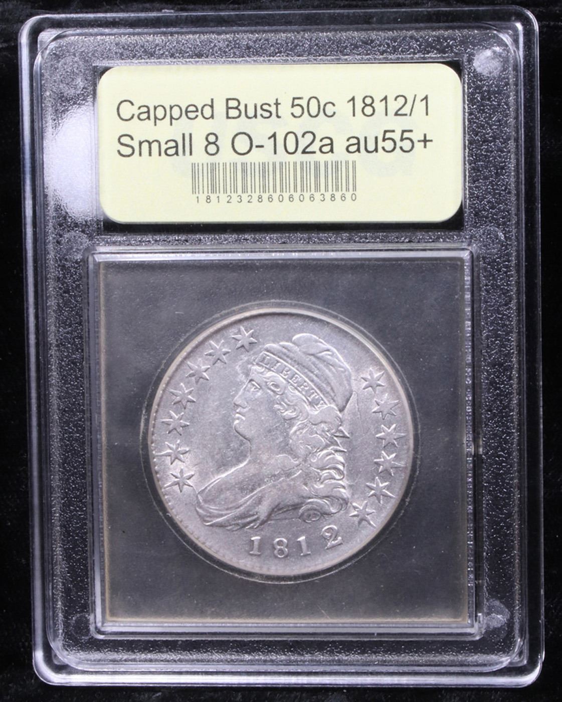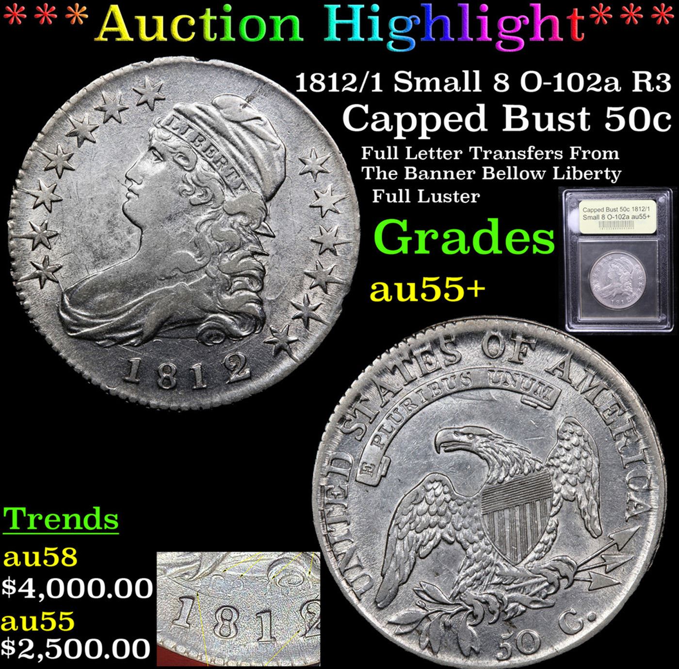 ***Auction Highlight*** 1812/1 Small 8 O-102a R3 Capped Bust Half Dollar 50c Graded Chouce AU+ BY USCG. The small 8 in the date and the remnants of an under type 1 below the primary 2 identify the O-102 variety. A blurry die crack from the base of the second 1 to the stand of the overpunched 1 and the clash marks above the date identify the late die state O-102a. Superb vibrant luster enhances the pleasing surfaces of this near-Uncirculated specimen, with scattered, minor signs of wear and vibrant mint luster throughout. The design elements are well-detailed, showing some of the usual flatness on four of the obverse stars. The wild letter transferred die clashing above the date is striking. Bold overdate. A coin worth owning. Good luck. A Corey's Pick, Bid to Win, Don't let it get Away Coin