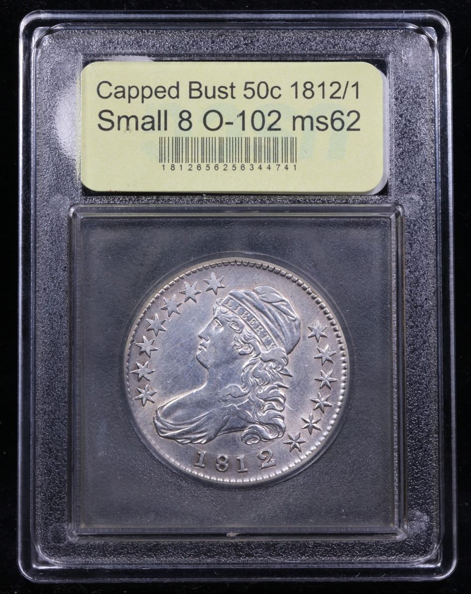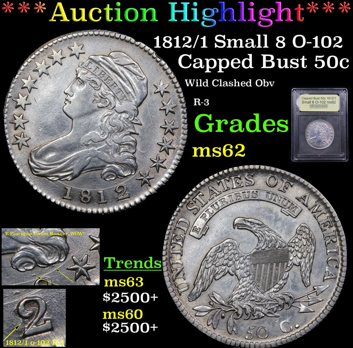 ***Auction Highlight*** 1812/1 Small 8 O-102 Capped Bust Half Dollar 50c Graded Select Unc By USCG. Up for auction is a Capped Bust Half dollar that is highly sought and coveted among collectors. It is the 1812/1 Capped Bust Half Dollar. This is the o-102, the only variety with the small 8 and the 2/1 overdate. This variety comes in two ways. One is without the wild die clashing and one is with. The wild Die clashing is on the obverse and is virtually the entire �E Pluribus Unum� Banner. This sub variety is the most prized by collctors, and is the one at hand! Per Ron Guth of PCGS �: The 1812/1 Half Dollar is one of several overdates in the Capped Bust Half Dollar series. Two 1812/1 overdates are known: one with a Large 8 and another with a Small 8. Both were created when leftover 1811 dies were overdated in 1812 instead of simply discarding the old dies. Only one die pair (Overton 102) is known of the 1812/1 Small 8 variety.