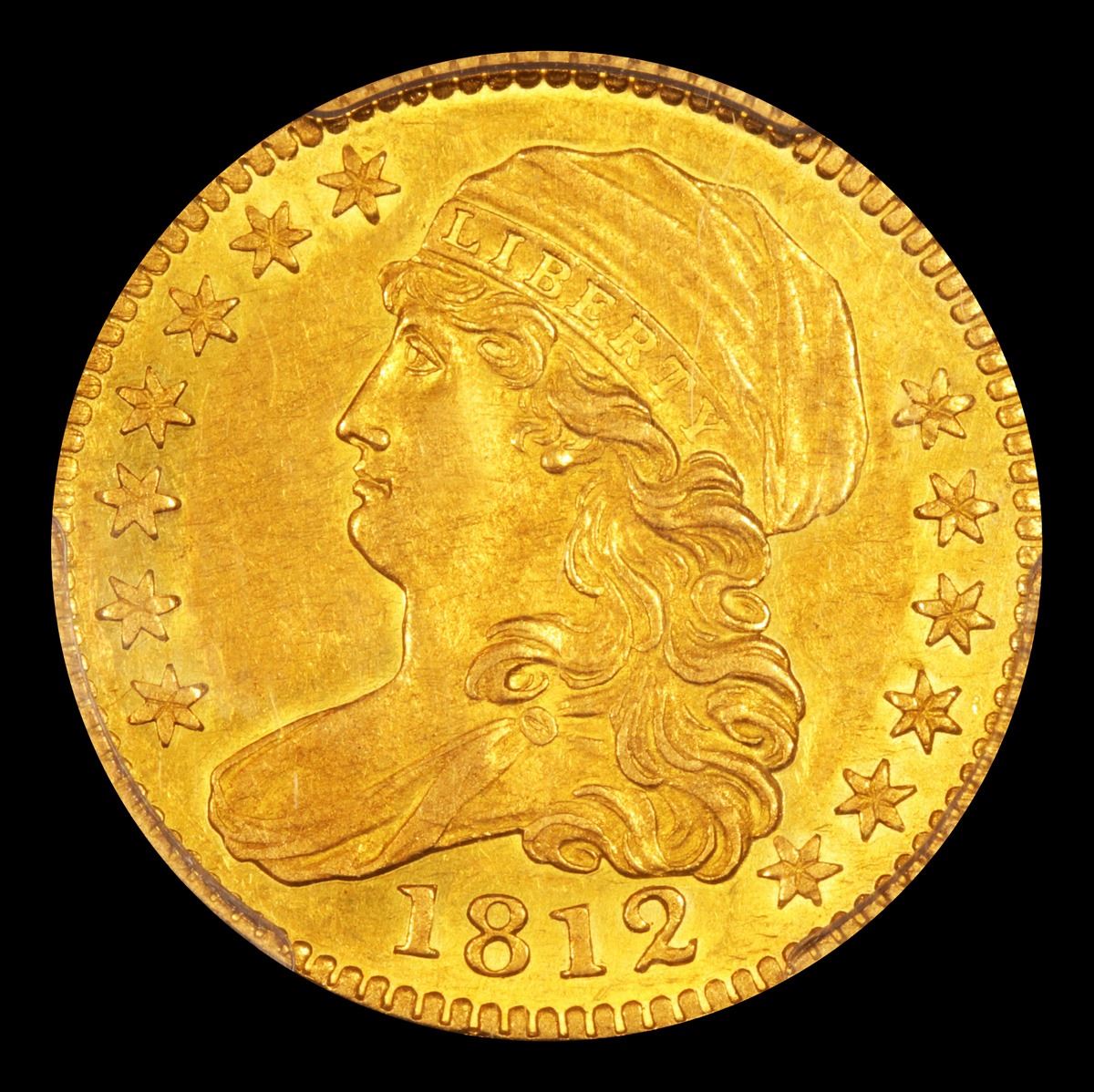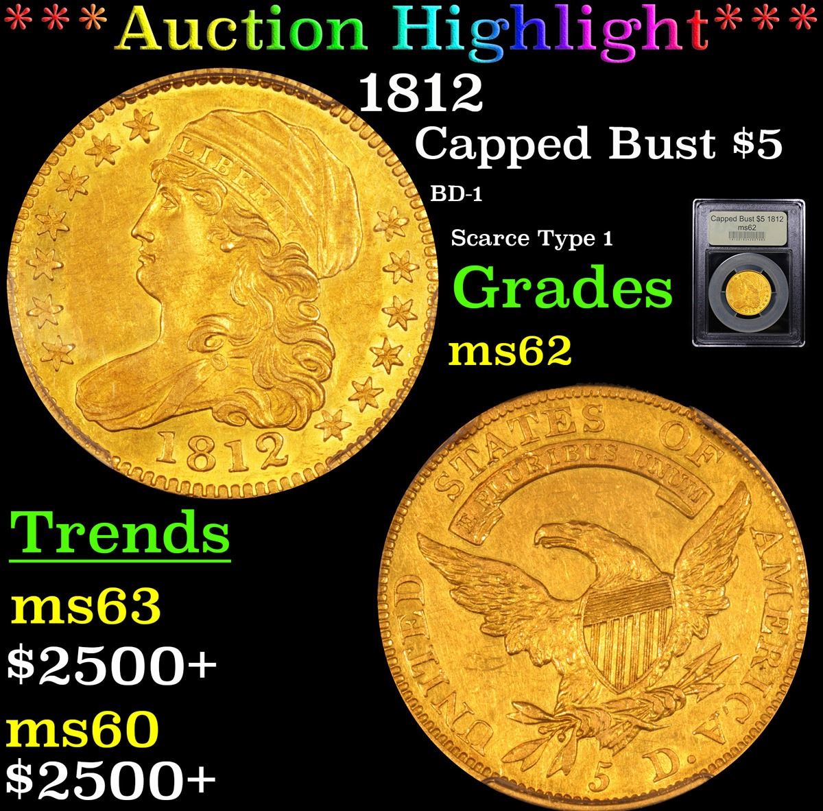 ***Auction Highlight*** 1812 BD-1 Scarce Type 1 Capped Bust $5 Gold Graded Select Unc By USCG. Ultra Rare final year of issue of this scarce Type 1 Capped Bust $5 gold piece. Superb eye appeal, great color. This ultra rare and highly sought early gold trends as follows, ms63 $27,500 ms62 $22,500 ms61 $19,5000 ms60 $13,500 - just for the record, the coin trends $5000 in VF, and it generally trades at full or over full trends value. A Corey's Pick, Bid to Win, Don't let it get Away, you might not find its equal Coin. I give this coin my highest recommendation