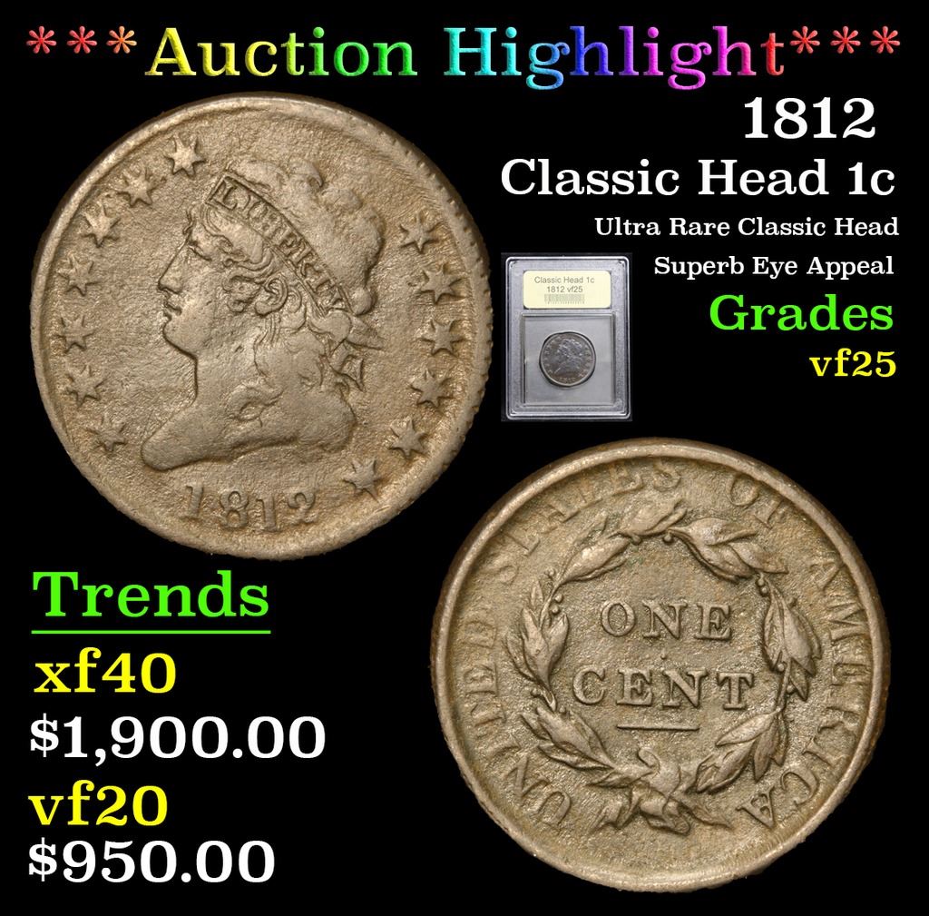 ***Auction Highlight*** 1812 Classic Head Large Cent 1c Graded vf+ By USCG. Pleasing color; Incredibly scarce Classic Head A Corey's Pick, Bid to Win, Don't let it get Away Coin