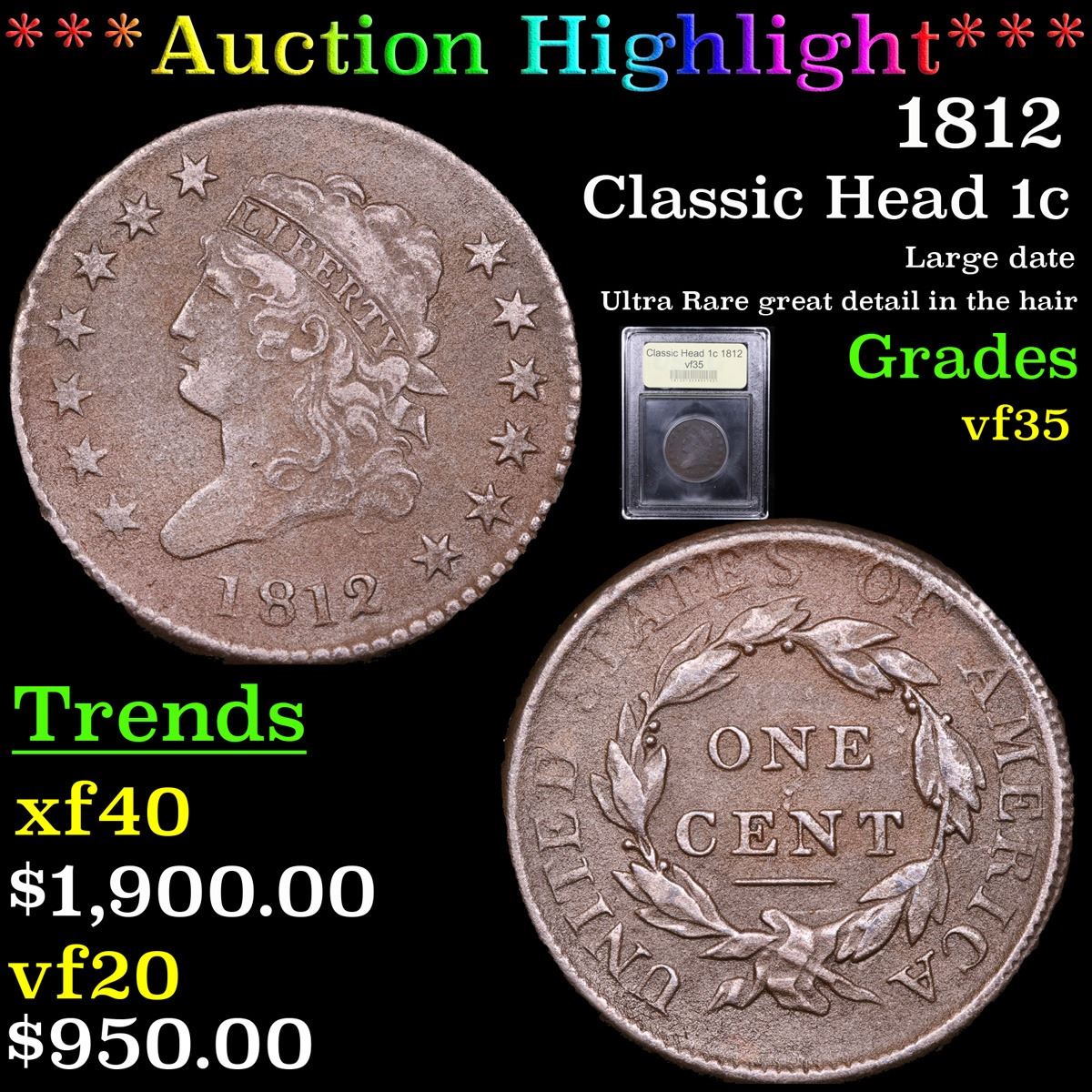 ***Auction Highlight*** 1812 Large date Ultra Rare great detail in the hair Classic Head Large Cent 1c Graded vf++ By USCG. A Corey's Pick, Bid to Win Coin