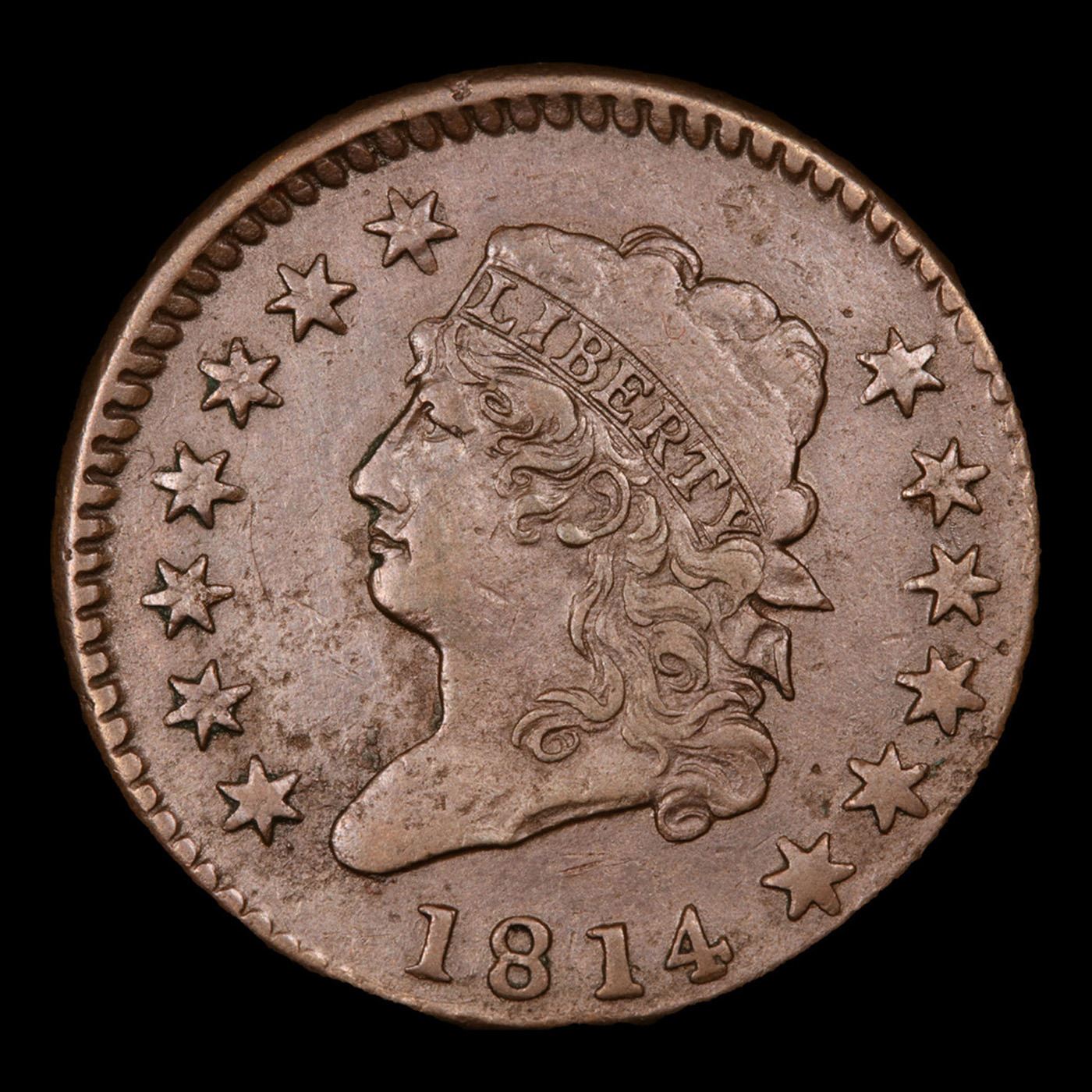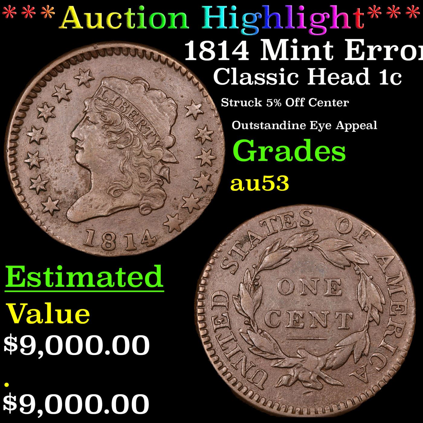 ***Auction Highlight*** 1814 Mint Error Crosslet 4 Classic Head 1c Graded au53 BY SEGS. Up for auction is a thoroughly appealing, premium quality example of a challenging large cent type, the 1814. Smooth, glossy, deep copper surfaces are remarkably well preserved with only a few minor, easily overlooked marks scattered about. The strike is 5% off center to the lower obverse and upper reverse, affecting the denticulation in those areas. Otherwise we note bold to sharp definition throughout. Poor planchet stock made the Classic Head cent as a type more susceptible to environmental damage and other impairments during commercial use, with the result that high grade, high quality survivors are difficult to find. Indeed, we anticipate strong competition for this superior AU among both type collectors and early copper enthusiasts. A Corey's Pick, Bid to Win, Don't let it get Away, you might not find its equal Coin