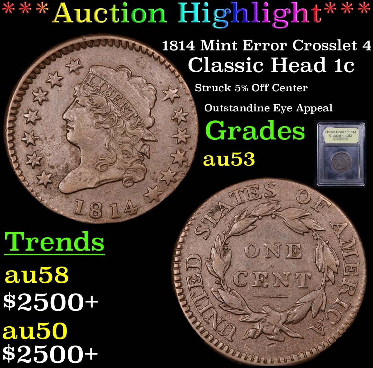 ***Auction Highlight*** 1814 Mint Error Crosslet 4 Classic Head 1c Graded Select AU By USCG. Up for auction is a thoroughly appealing, premium quality example of a challenging large cent type, the 1814. Smooth, glossy, deep copper surfaces are remarkably well preserved with only a few minor, easily overlooked marks scattered about. The strike is 5% off center to the lower obverse and upper reverse, affecting the denticulation in those areas. Otherwise we note bold to sharp definition throughout. Poor planchet stock made the Classic Head cent as a type more susceptible to environmental damage and other impairments during commercial use, with the result that high grade, high quality survivors are difficult to find. Indeed, we anticipate strong competition for this superior AU among both type collectors and early copper enthusiasts. A Corey's Pick, Bid to Win, Don't let it get Away, you might not find its equal Coin