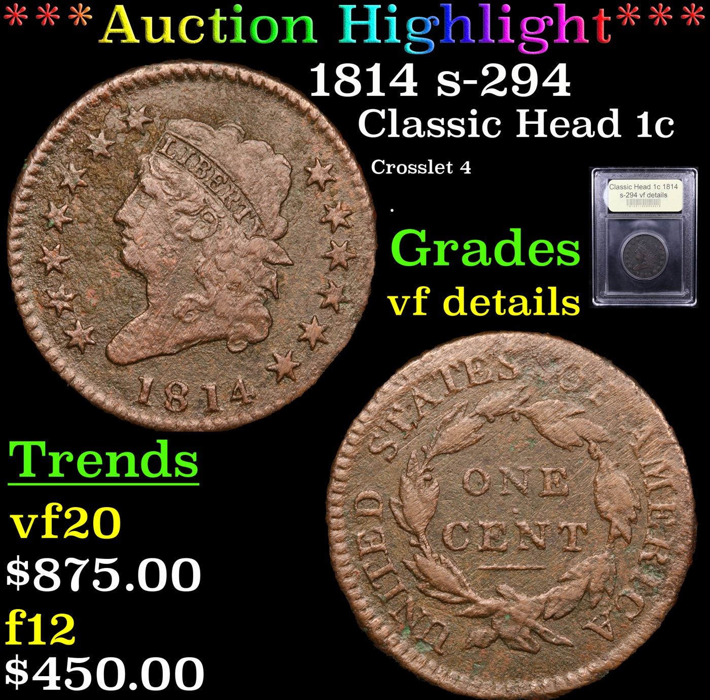 ***Auction Highlight*** 1814 s-294 Classic Head Large Cent 1c Graded vf details By USCG (fc)