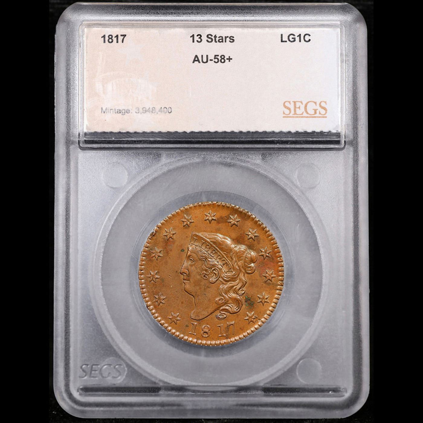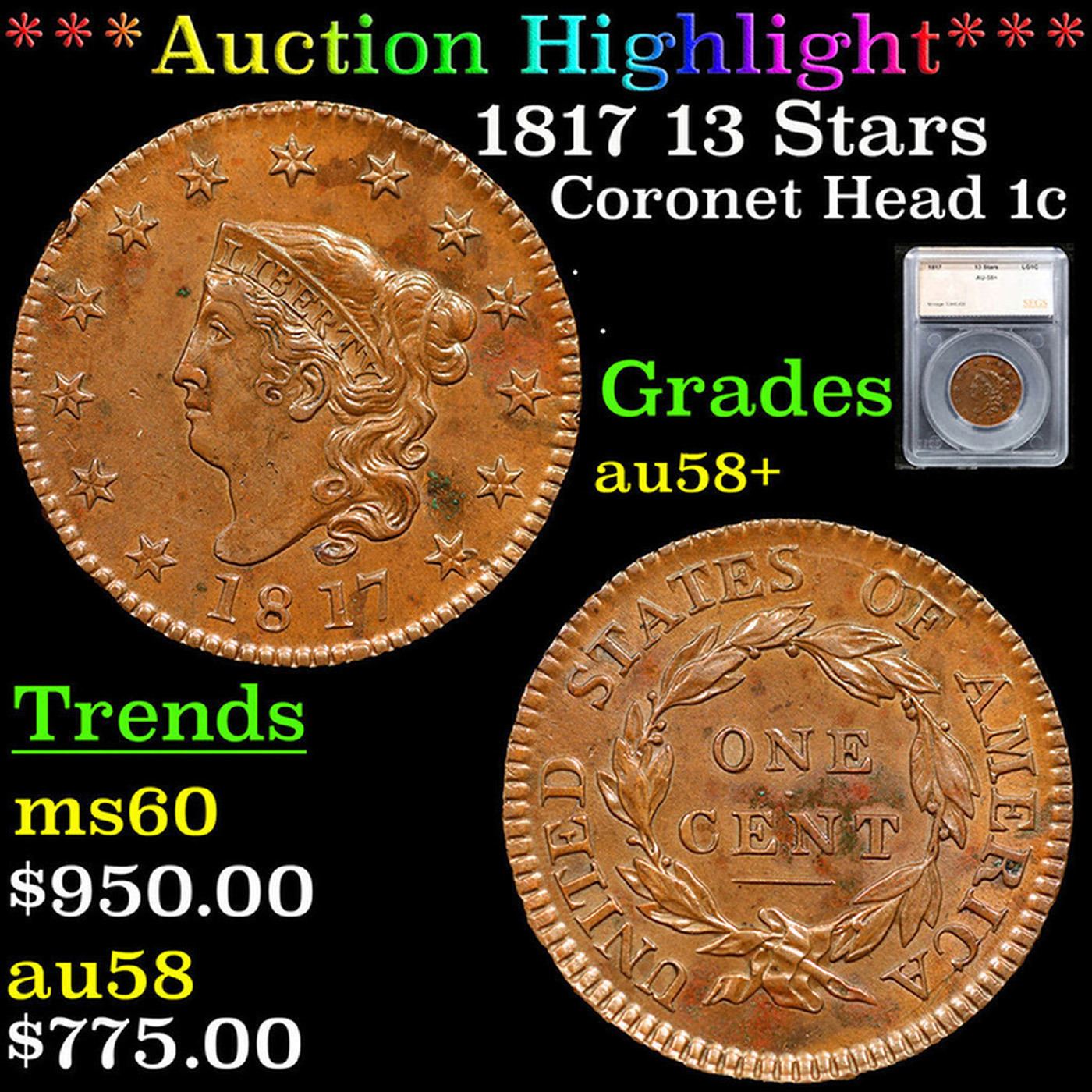 ***Auction Highlight*** 1817 13 Stars Coronet Head Large Cent 1c Graded au58+ By SEGS. A Corey's Pick, Bid to Win Coin