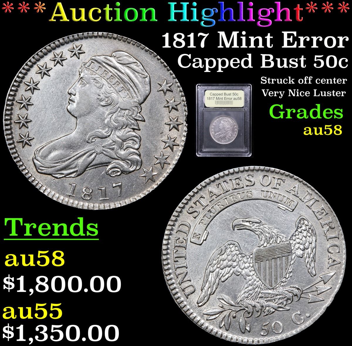 ***Auction Highlight*** 1817 Mint Error Capped Bust Half Dollar 50c Graded Choice AU/BU Slider By US