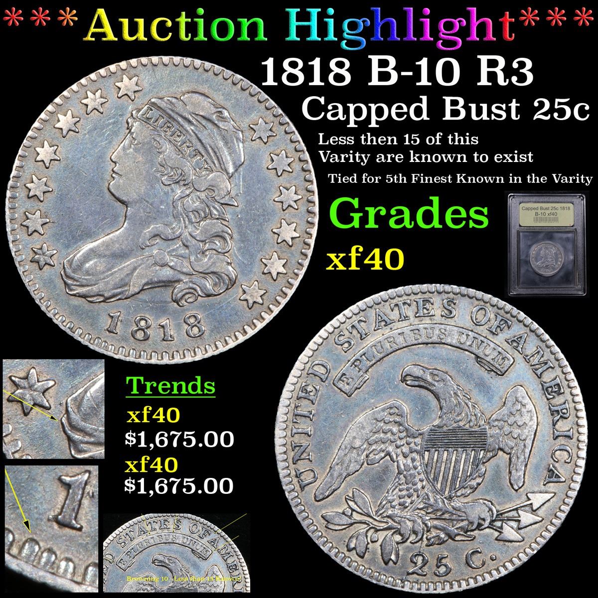 ***Auction Highlight*** 1818 B-10 R3 Capped Bust Quarter 25c Graded xf By USCG. This album toned beauty possesses an even steel gray patina. Overall lightly worn, yet still retaining bold to sharp definition to the devices. Uncommonly smooth surfaces further enhance the desirability of this large size Capped Bust quarter type candidate. Tied for 5th finest known of the very scarce variety. Per the census, less than 15 of the Browning 10 exist. A Corey's Pick, Bid to Win, Don't let it get Away, you might not find its equal Coin