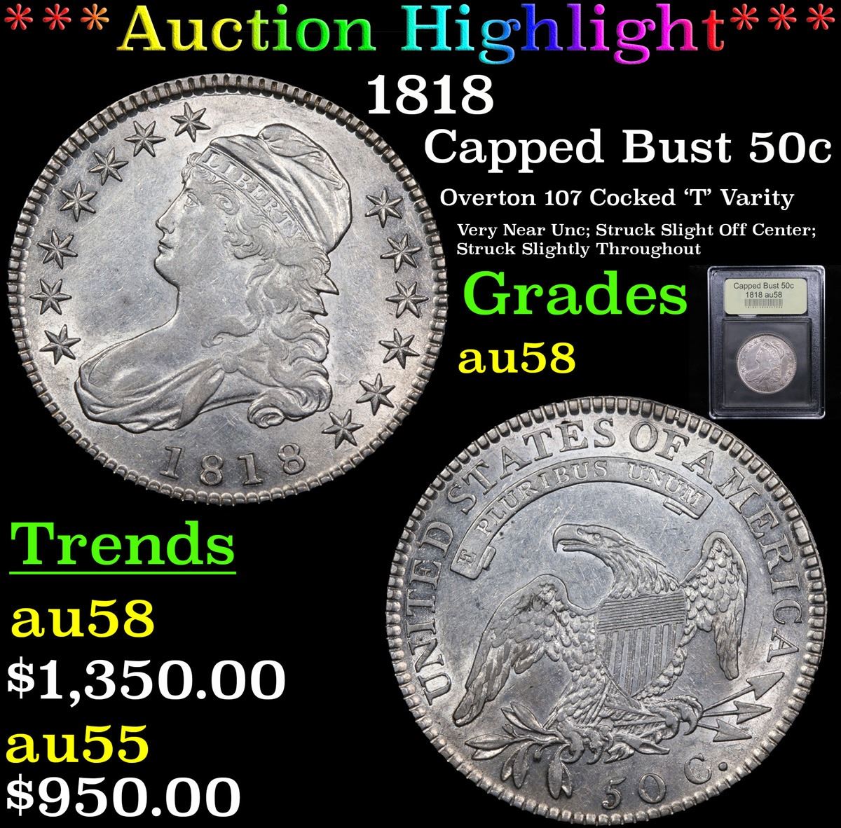 ***Auction Highlight*** 1818 Overton 107 Cocked 'T' Varity Very Near Unc; Struck Slight Off Center; Struck Slightly Throughout Capped Bust Half Dollar 50c Graded Choice AU/BU Slider By USCG. A Corey's Pick, Bid to Win, Don't let it get Away Coin