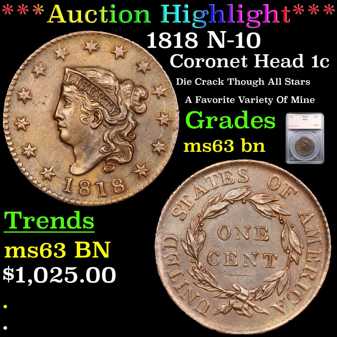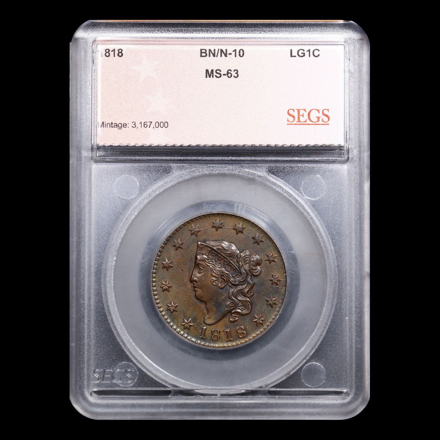 ***Auction Highlight*** 1818 Coronet Head Large Cent N-10 1c Graded ms63 bn BY SEGS (fc)