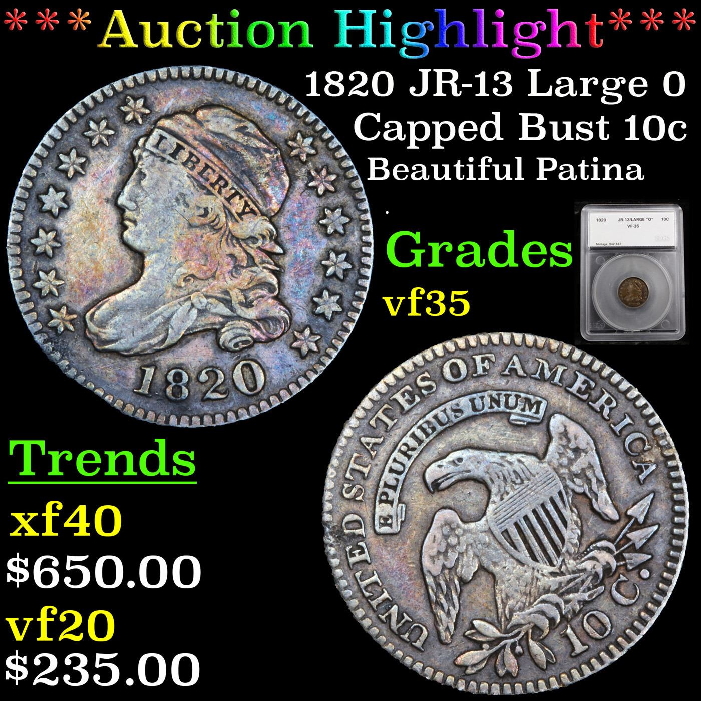 ***Auction Highlight*** 1820 JR-13 Large 0 Capped Bust Dime 10c Graded vf35 By SEGS (fc)