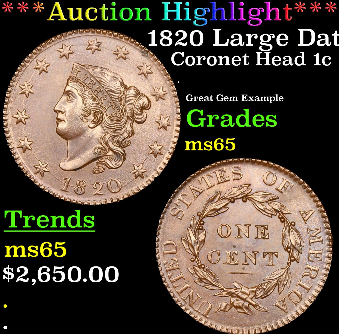 ***Auction Highlight*** 1820 Large Date N-13 Coronet Head Large Cent 1c Graded ms65 By SEGS. A Key Date's Pick, Bid to Win, Don't let it get Away, you might not find its equal Coin