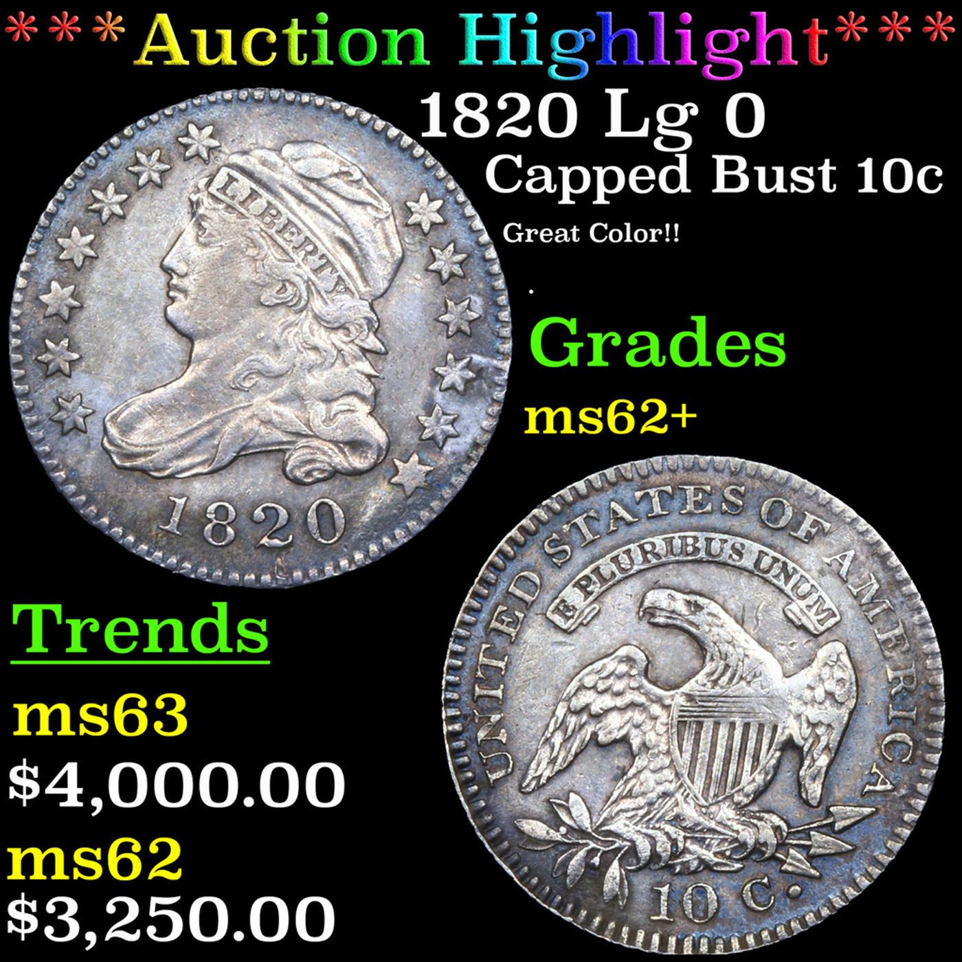 ***Auction Highlight*** 1820 Lg 0 Capped Bust Dime 10c Graded ms62+ By SEGS. A Key Date's Pick, Bid to Win, Don't let it get Away Coin