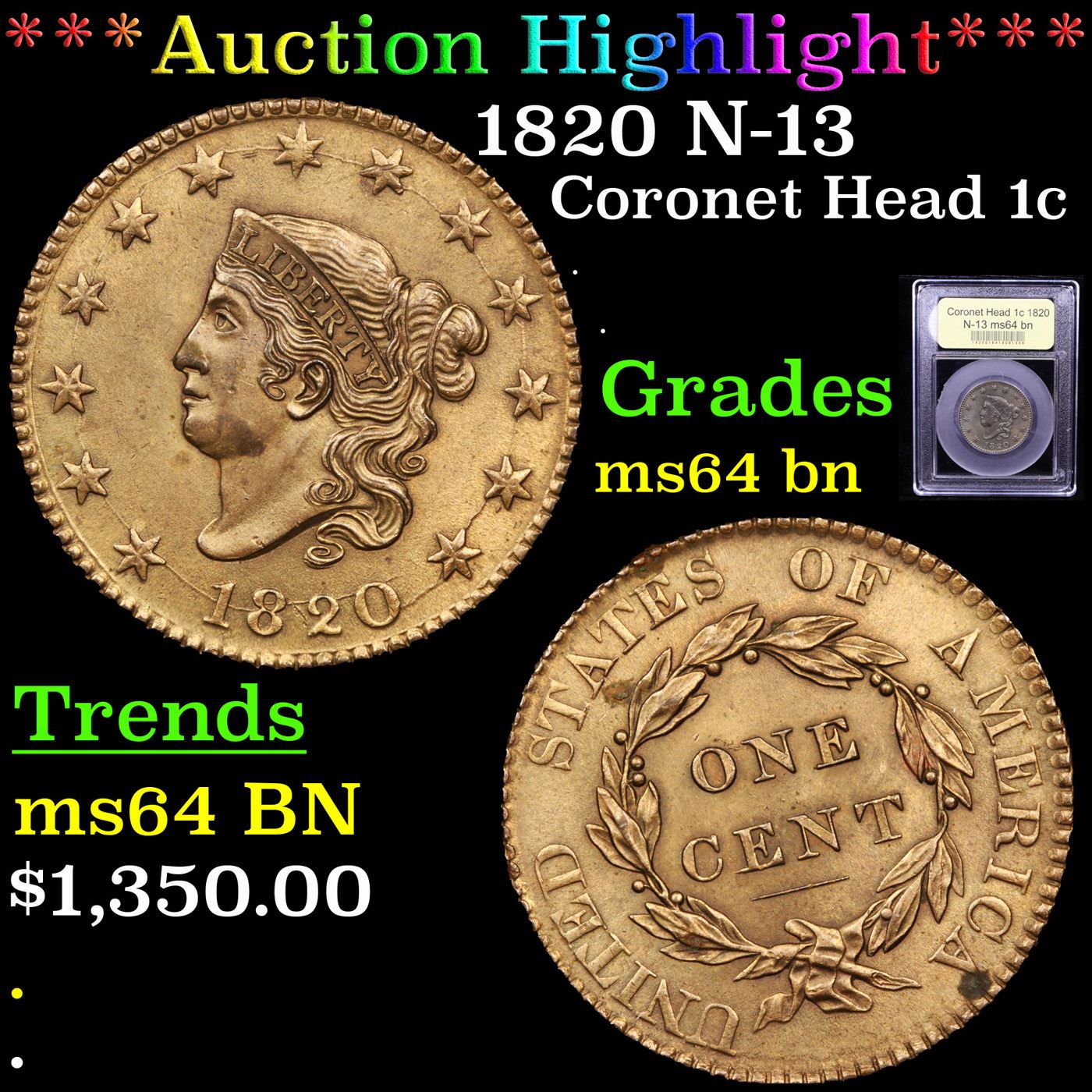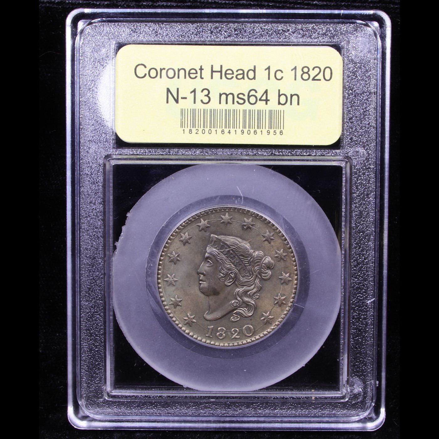 ***Auction Highlight*** 1820 N-13 Coronet Head Large Cent 1c Graded Choice Unc BN By USCG (fc)